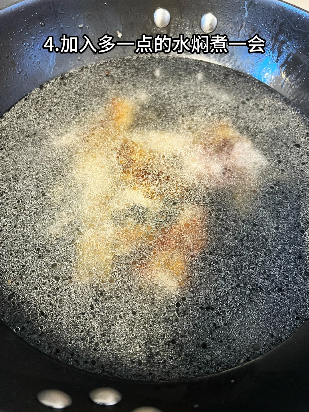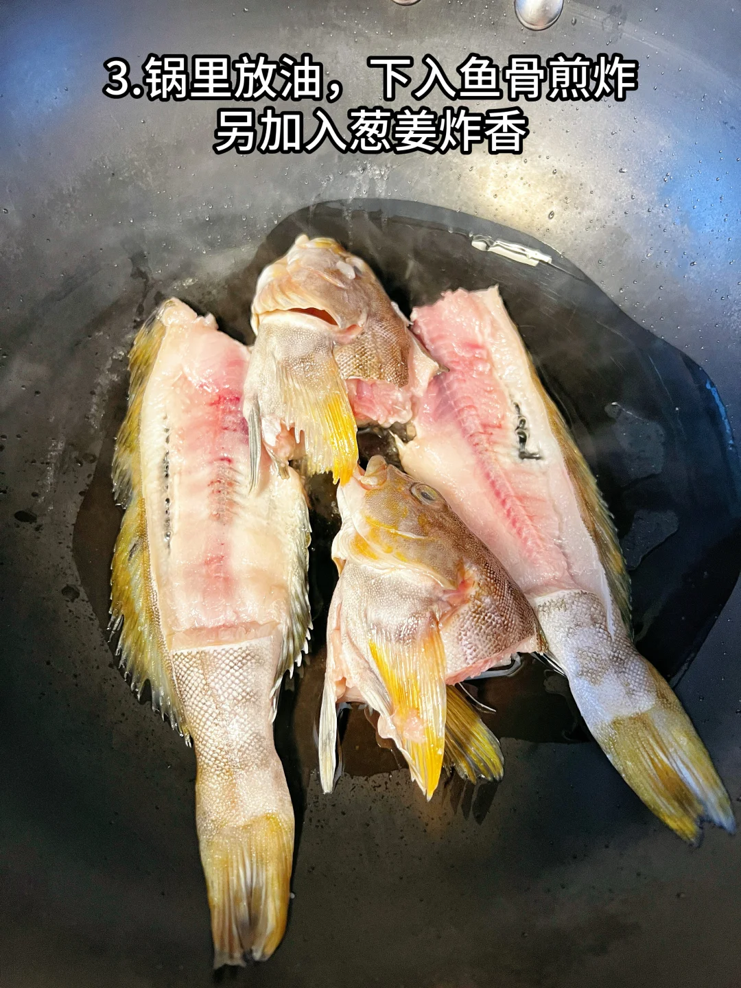 3、锅里放油,下入鱼骨煎炸,另加入葱姜炸香