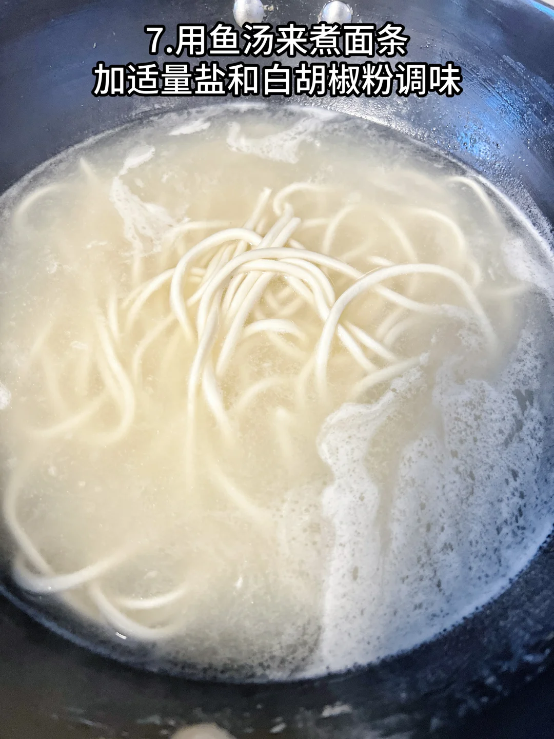 7、用鱼汤来煮面条,加适量盐和白胡椒粉调味