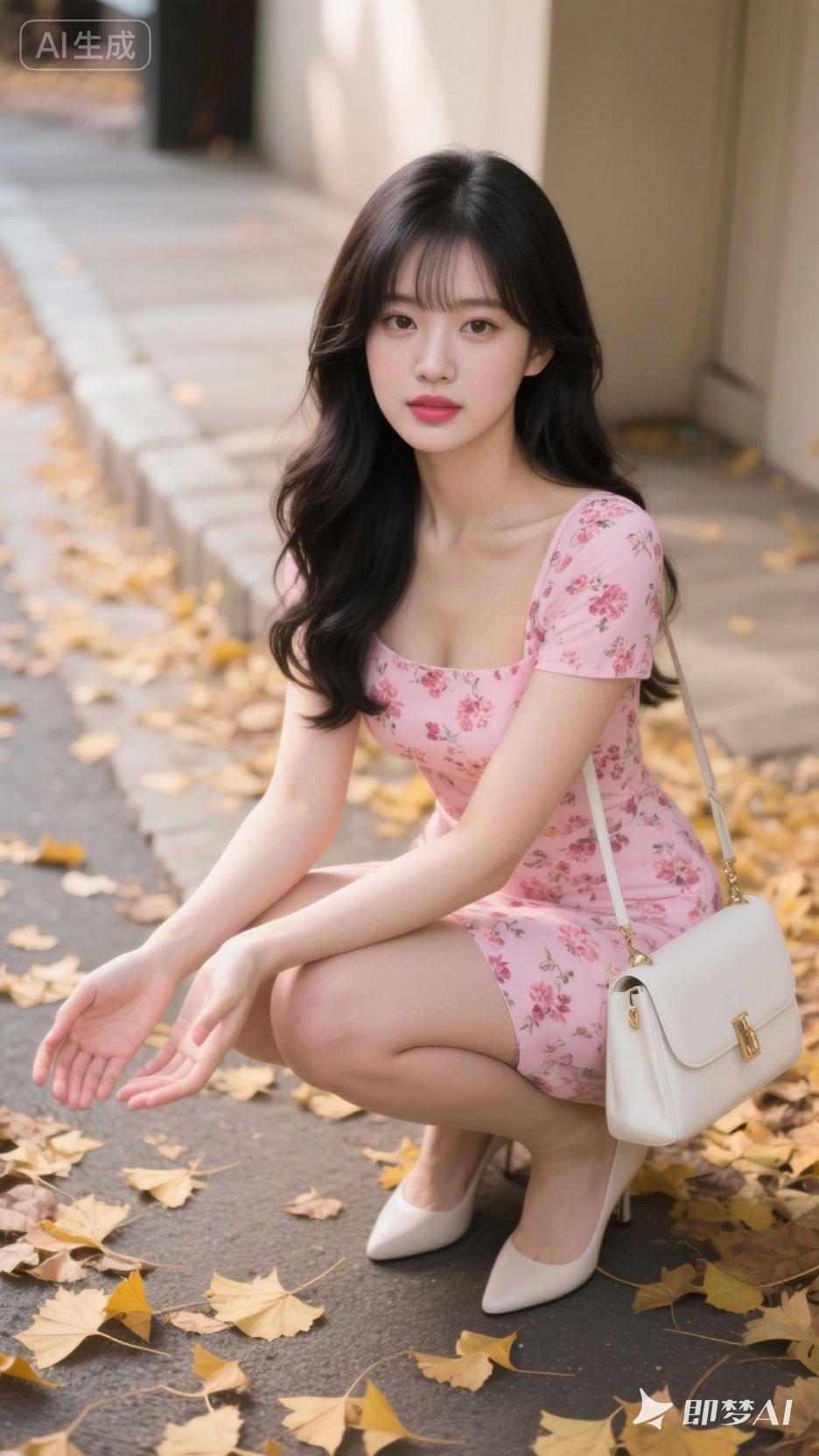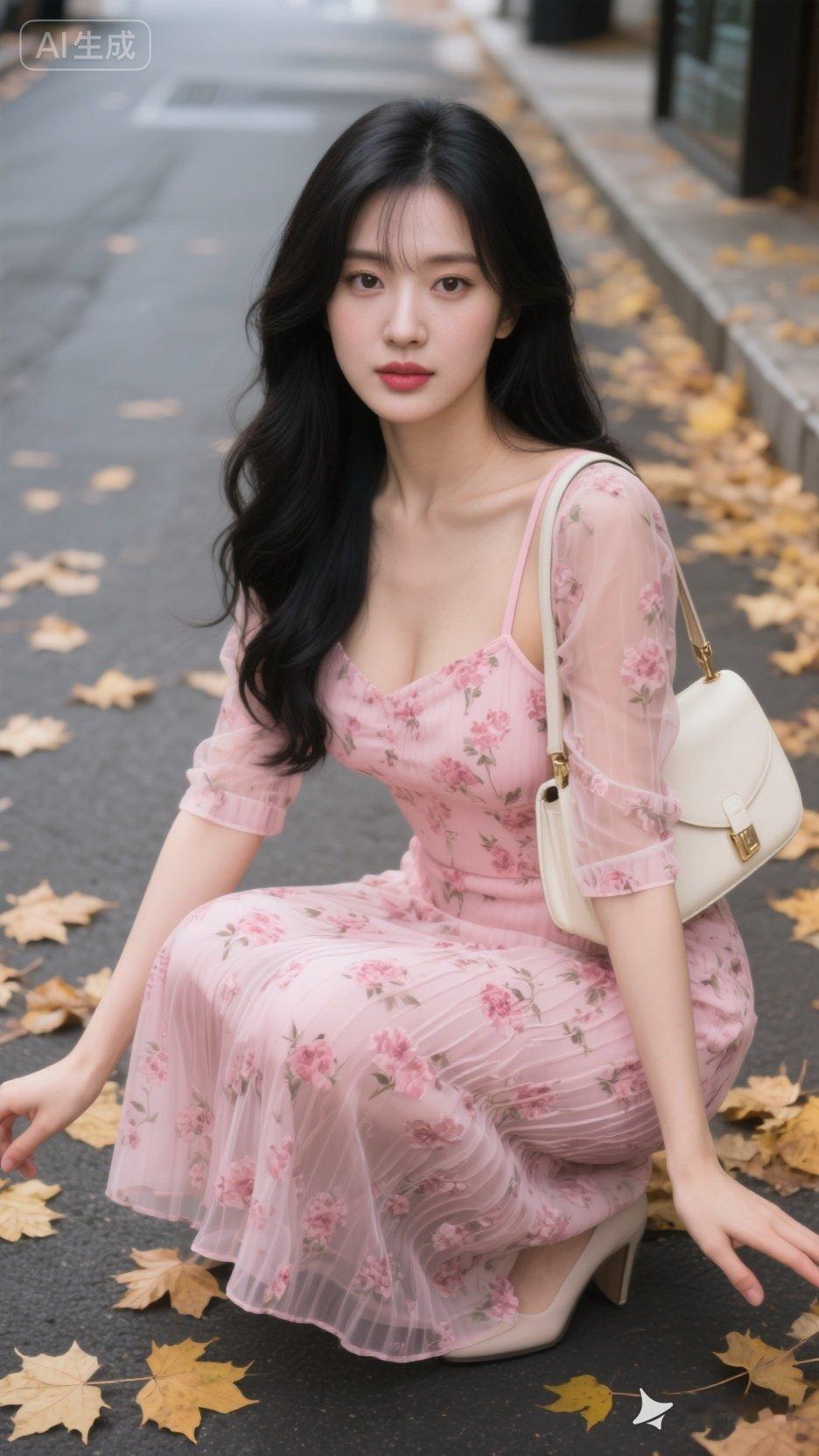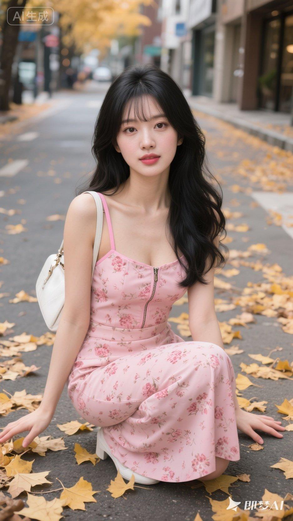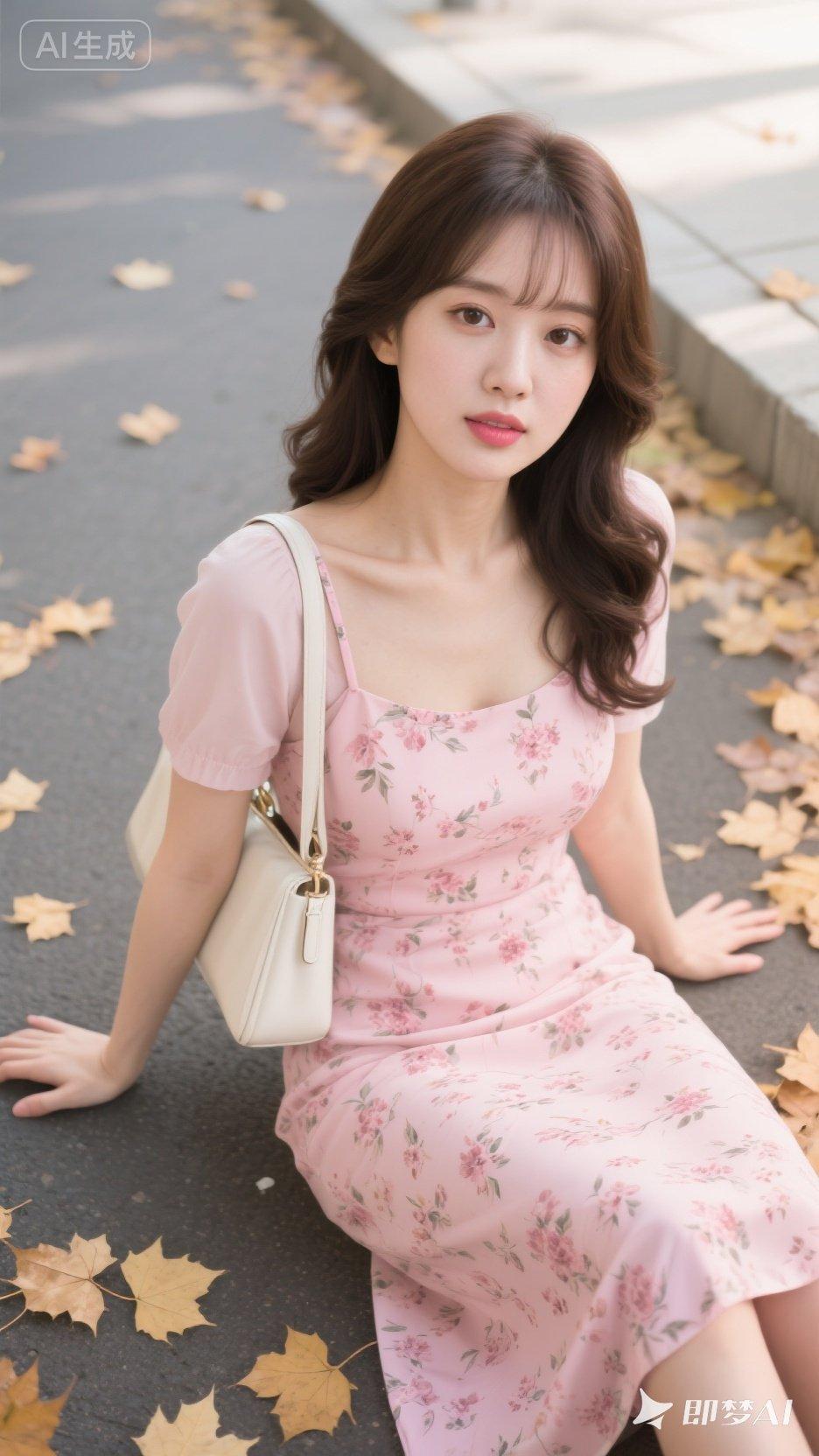 粉色连衣裙与落叶的浪漫邂逅