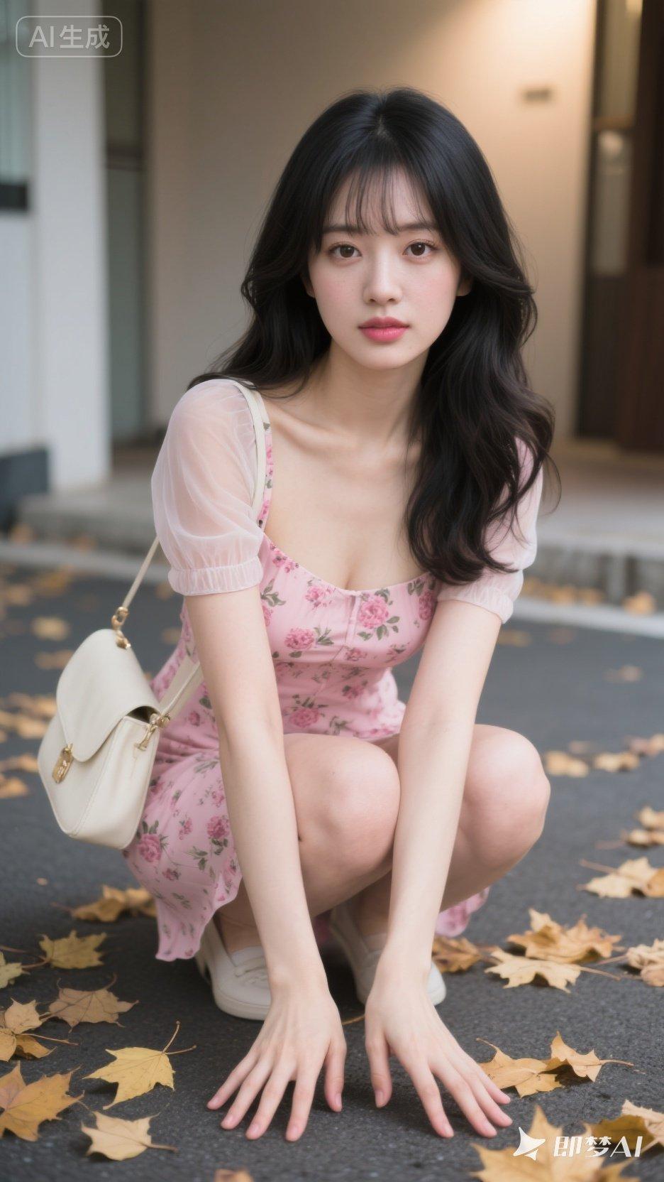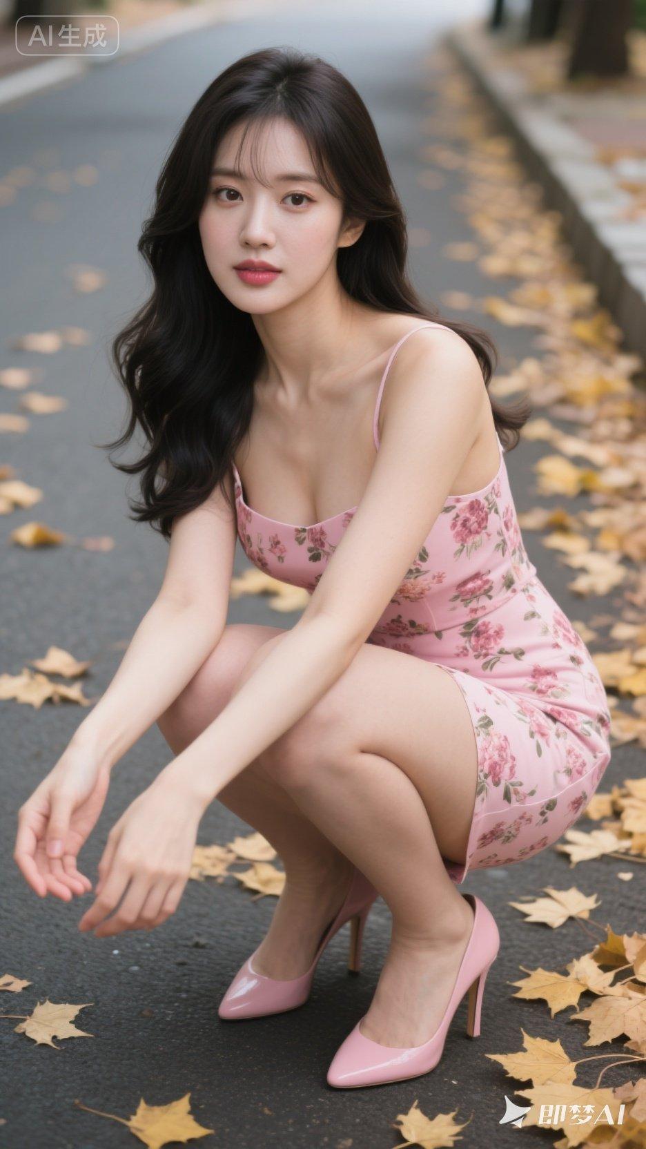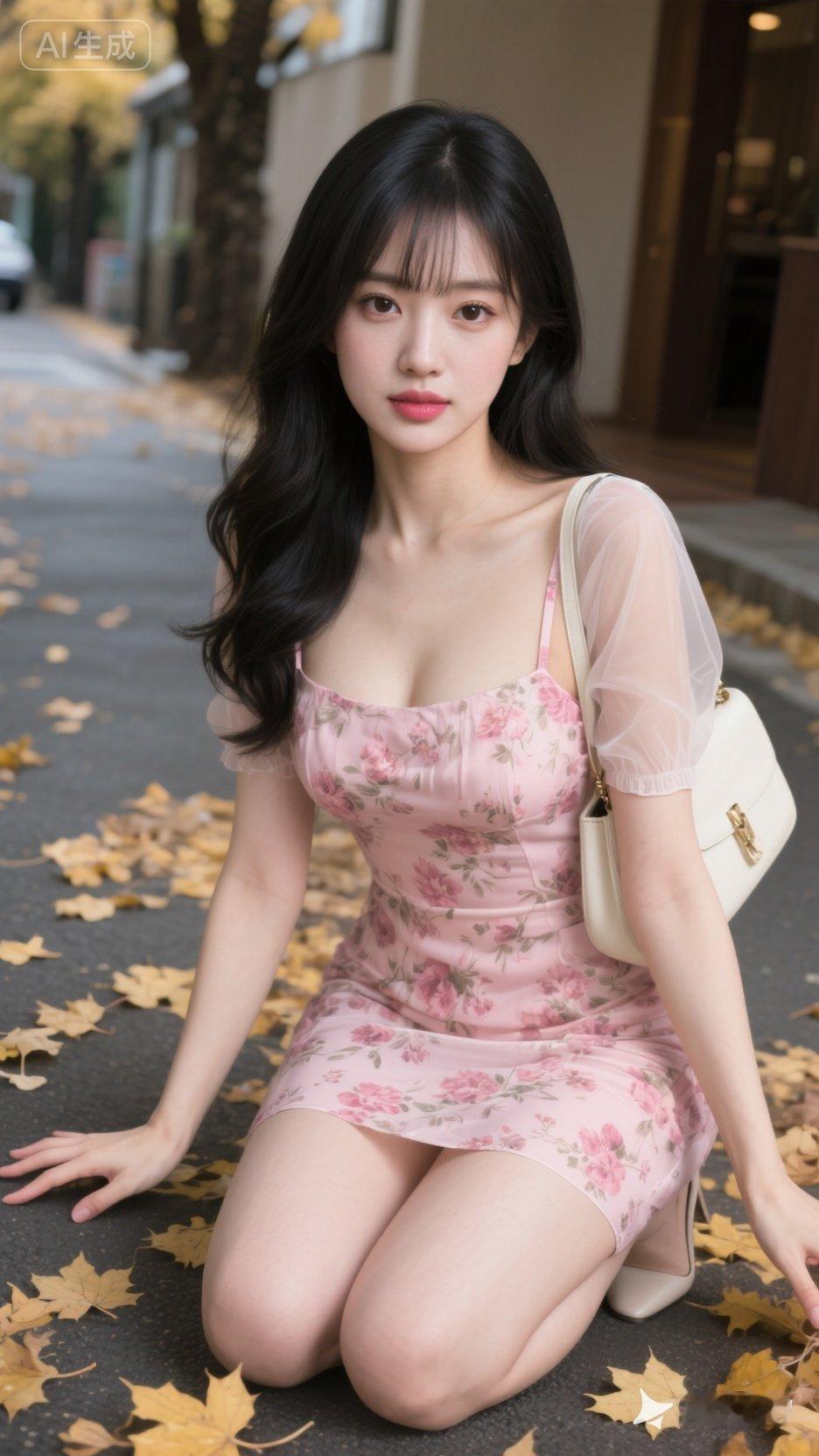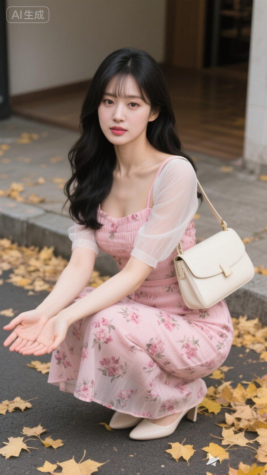 粉色连衣裙与落叶的浪漫邂逅
