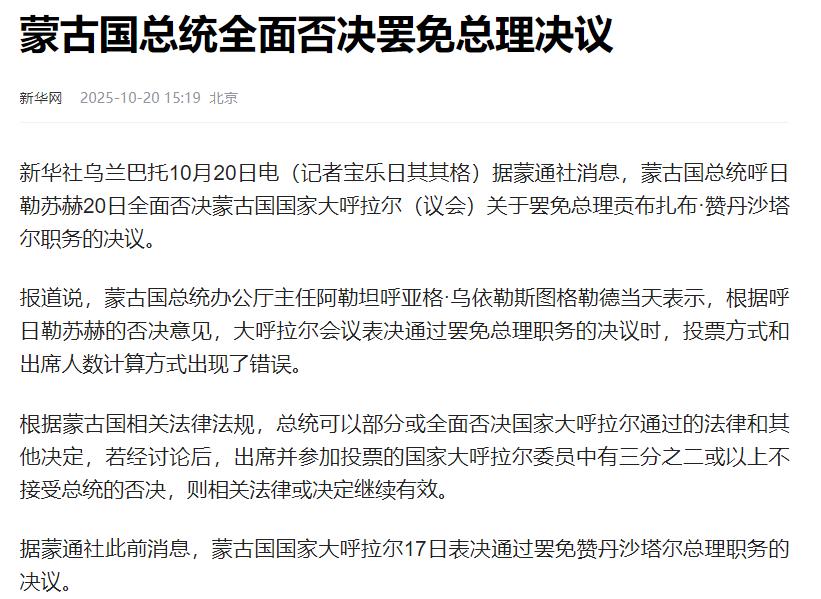 蒙古国总理遭罢免,上台仅4个月,推动多项对华合作。   10月17日,蒙古国的议会上,以71票赞成、40票反对的结果,通过了解除赞丹沙塔尔总理职务的决议,理由是其执政期间“违反宪法程序”,而深层原因则与他积极推进的对华合作密不可分。   赞丹沙塔尔自今年6月上任以来,把对华合作作为经济发展的重要抓手。他推动的中蒙俄“西伯利亚力量2号”天然气管道项目,一旦建成每年能为蒙古带来10亿美元过境费,相当于该国GDP的3.6%。   还有甘其毛都-嘎顺苏海图铁路,设计年运力3000万吨,能让蒙古煤炭出口成本降低40%,每年增加21亿美元收入。   这些项目本是缓解蒙古经济困境的关键,但却触动了国内部分利益集团的奶酪,也让亲美派势力不满,认为其“过度亲华”,最终成为被罢免的导火索。   从经济现实来看,蒙古对中国的依赖度本就很高。作为内陆国,蒙古90%的外贸要通过中国口岸,87%的能源出口流向中国。2025年前三季度,蒙古对华煤炭、铜矿石、稀土出口分别增长23%、18%和47%,这些资源出口是其财政收入的重要来源。   而蒙古当前外汇储备仅42亿美元,只够覆盖三个月进口,每年还需15亿美元外部融资才能维持收支平衡,对华合作项目的重要性不言而喻。   好在今天,蒙古国总统行使否决权,暂时搁置了这一决议,但政治风波尚未完全平息。   此次风波也暴露了蒙古政治生态的问题。根据蒙古宪法,总理由议会多数党组建,但总统拥有否决权,这种权力制衡在实际中常沦为政党博弈工具。   赞丹沙塔尔所属政党虽占议会多数席位,但党内派系林立,此次罢免案中有23名本党议员倒戈支持反对派。加上蒙古长期受“资源诅咒”影响,10%的富人掌握42%的财富,贫困率达38%,制度性腐败让改革阻力重重,赞丹沙塔尔推动的反腐和政务透明措施也遭到抵制。   目前来看,中蒙合作的基本面暂未改变,“西伯利亚力量2号”等项目仍在推进中。对蒙古而言,在大国博弈中保持务实很重要,美国、日本虽承诺投资稀土等项目,但实际进展缓慢,反观中蒙合作项目能带来实实在在的收益。   这场政治危机最终考验着蒙古的战略定力,而对我们来说,深化务实合作仍是应对变局的关键,毕竟稳定的中蒙合作对区域经济发展有着重要意义。