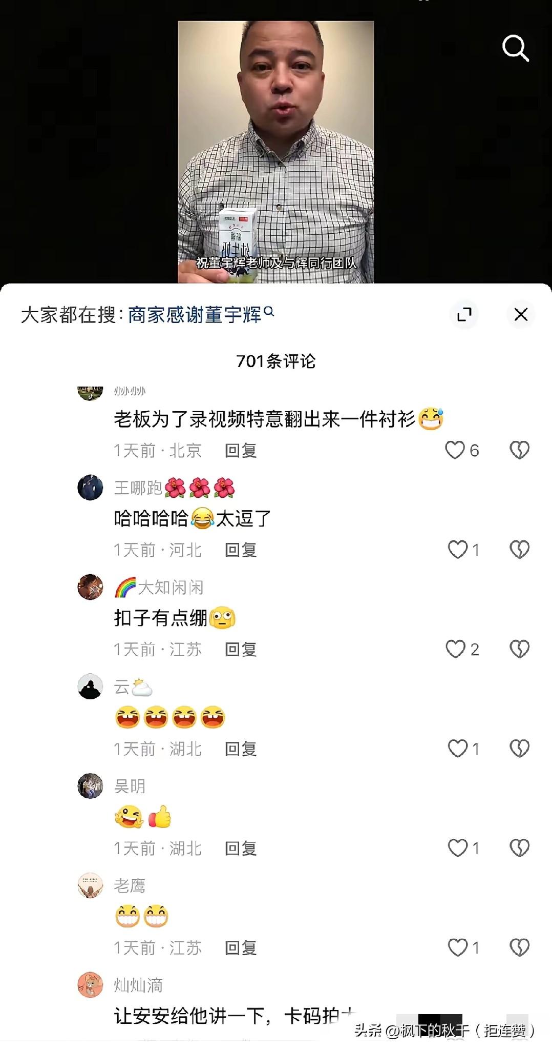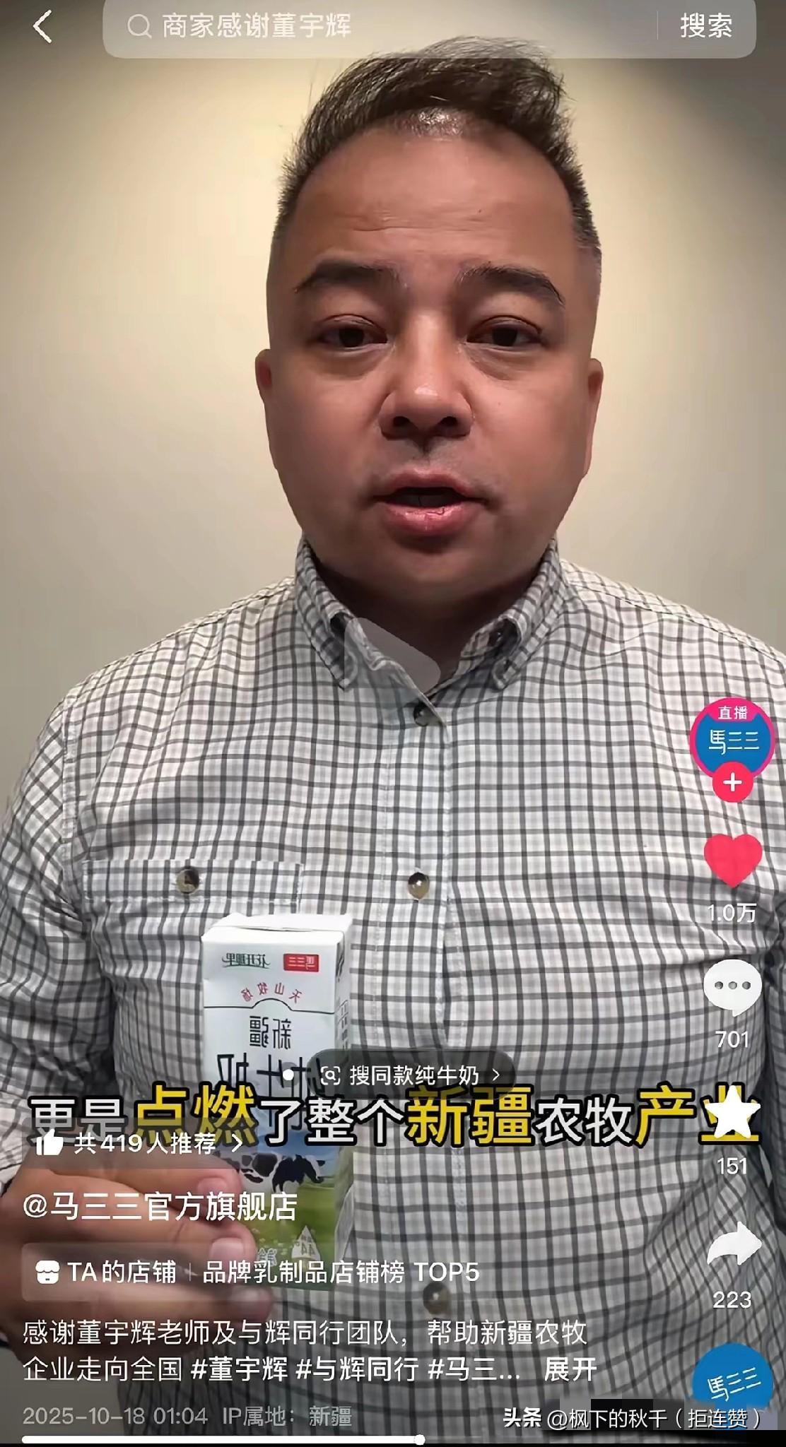 董宇辉新疆行感谢卖断货老板,结果全网都在盯他的衬衫! 笑不活了家人们!董宇辉新疆直播把马三三产品卖空,专门发视频感谢董事长,谁能想到重点全跑偏,董事长那件偏小的衬衫直接火出圈! 本来评论区该夸产品好、感谢董宇辉带货,结果画风突变——有人说“听完老板讲话,特意倒回去看衬衫”,还有人误以为品牌顺带卖衬衫,连“买大一号”都安排上了,甚至有人先注意到董事长的“卡姿兰双眼皮”,被评论带偏后又回头扒衬衫,满屏的“哈哈哈哈”快溢出屏幕。 其实这事儿特有意思,比起刻意设计的宣传,这种接地气的“小意外”反而更戳人。一件不合身的衬衫,让严肃的感谢变成了网友的快乐源泉,也从侧面说明这场直播的真实和热闹——大家不是冷冰冰地买东西,更像在围观一场有温度的互动。 你们刷到这段视频时,是先注意到产品,还是被董事长的衬衫戳中笑点?有没有也倒回去看第二遍?评论区聊聊!