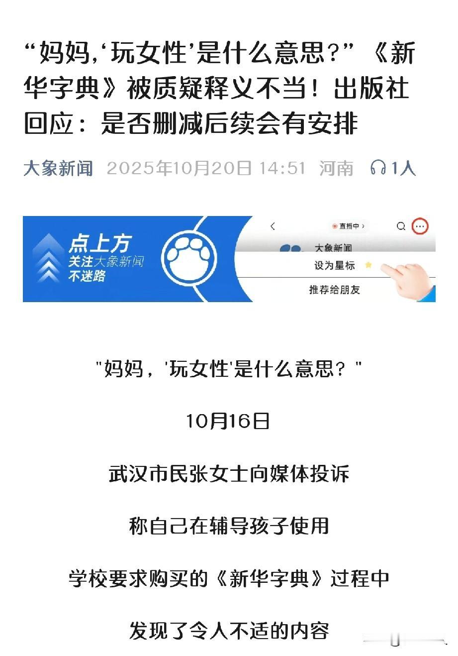 “妈妈,‘玩女性’是什么意思?” 一个一年级的小学生这样问妈妈 如果是你,你会怎么回答? 武汉的张女士向媒体投诉: 自己的儿子是一年级的小学生 在查阅《新华字典》对“玩”字的解析 竟赫然列着一条示例——“戏弄:玩女性。” 于是便向妈妈提出了开头的疑问 这个妈妈也是尴尬得脸红 一时不知道该怎么跟小孩解释 而出版社面对质疑和投诉 回应说:是否删减后续会有安排! 毒教材这种频频出现不雅内容的事 真的需要认真审核,改改了 下一代的教育,是容不得半点马虎的 (消息素材来源:大象新闻权威报道)