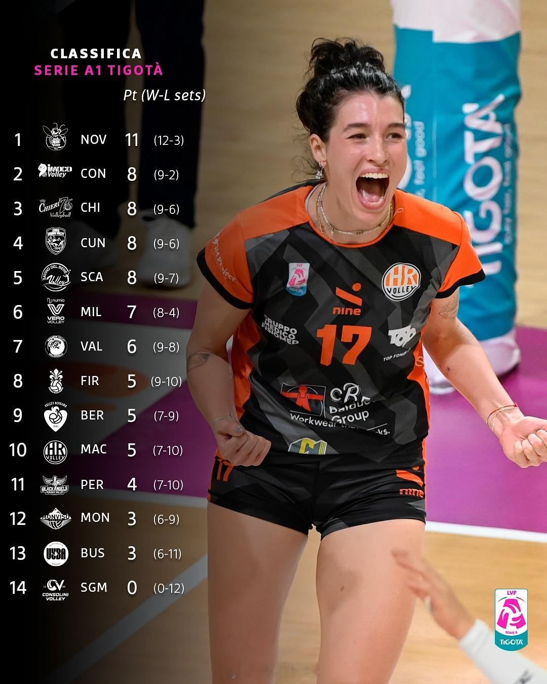 2025-2026女排意甲常规赛第4轮比赛结果及此轮过后的积分排名。科内利亚诺