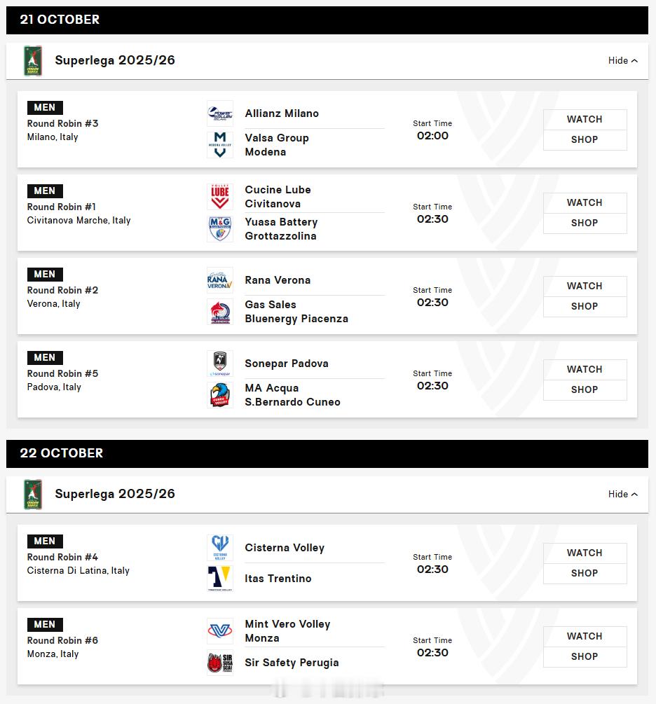 2025-2026男排意甲 常规赛今天开打,第1轮的竞赛日程如图。图一是意大利当地时间,图二是北京时间。