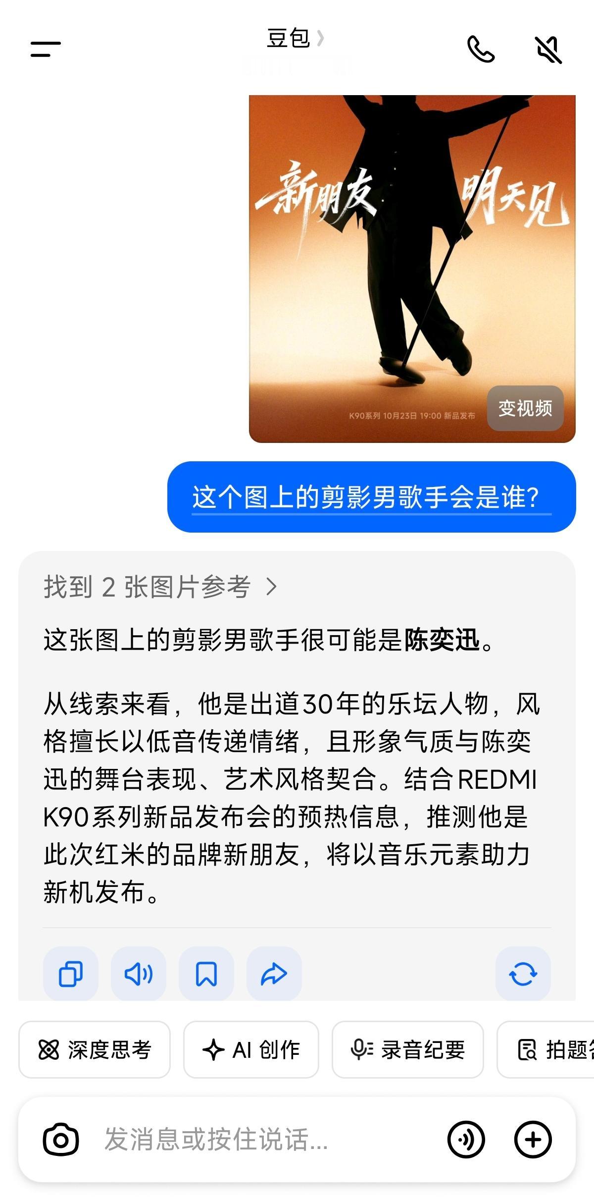 继王一博樊振东后,陈奕迅将成为红米K90系列代言人? 陈奕迅歌迷会账号转发了红米手机预热微博。 同时通过AI识别,该男歌手大概率为陈奕迅。 附送红米K90 Pro Max配置 5代骁龙8至尊版+D2独立显卡,7560毫安时大电池+100W + 50W,又塞了Bose音响,还有小米17系列上的光影猎人950与6.9英寸超级像素技术的屏幕,更补上了潜望式长焦。 这规格估计得涨个价。 如果卢伟冰能连夜说服雷军延续K80 Pro的定价,加量不加价(没戏),那就真超级香妃了。 3折iPhone17 Pro Max即将登场。 猜猜是卢伟冰主讲,还是老魏主讲? 你希望是谁?