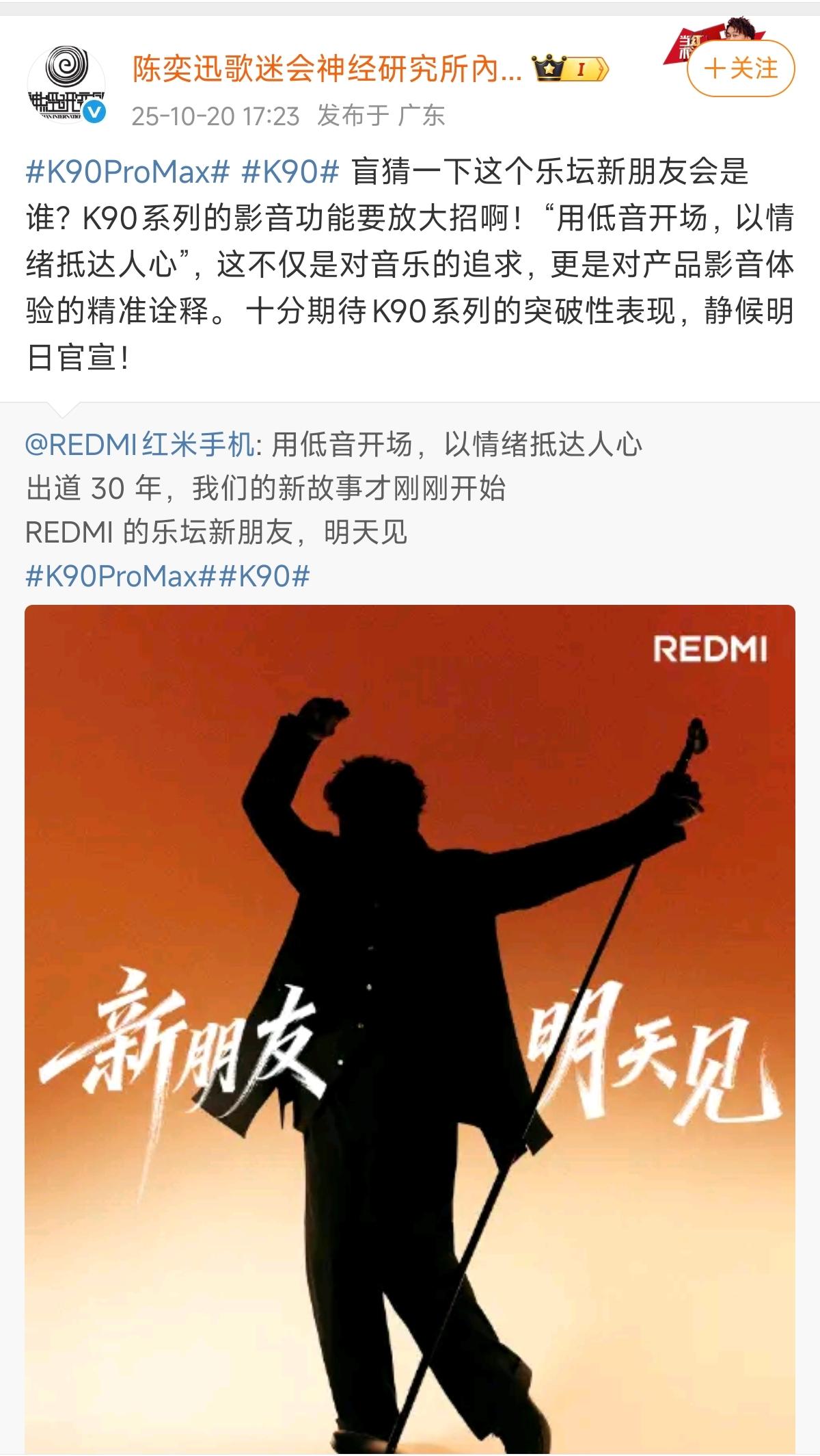 继王一博樊振东后,陈奕迅将成为红米K90系列代言人? 陈奕迅歌迷会账号转发了红