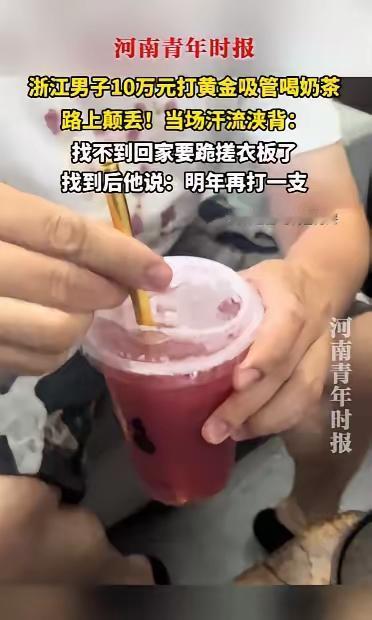 10万黄金吸管颠丢又熔铸!诸暨男子玩转出“财富新高度” 2025年10月,浙江诸暨寿先生豪掷10万,用100克纯金打造奶茶吸管。凌晨骑电动车轧井盖,吸管竟从兜中颠飞,急得他汗流浃背。 民警连夜地毯式搜寻,帮他寻回这件“黄金玩具”。吸管磕碰受损被熔铸,他直言明年再打一支,定做的黄金奥特曼也将到货——原来他定投黄金十余年,贵金属日常化是习惯。 恰逢金价高位震荡,每克超1200元,投资者纠结买卖。寿先生却把黄金玩成“奶茶搭档”,网友调侃“喝的是流动的金库”。说到底,这哪是用吸管,分明是用财富为趣味买单。 需要我再调整下幽默的尺度,让表述更紧凑些吗?