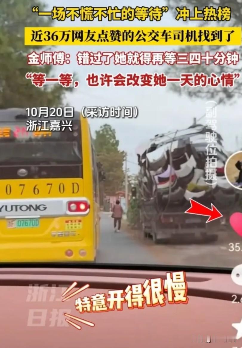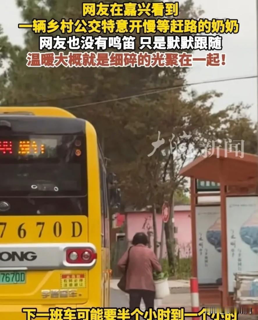 “一场不慌不忙的等待”善良的公交司机找到了,他叫金利军,是嘉兴244路公交车驾驶员,金师傅:等一等,也许会改变她一天的心情;骨子里善良的人啊。 老人在前面走,公交车在老人身后慢悠悠的开着,司机金师傅知道老人要坐车,如果错过,老人要等三四十分钟,金师傅说关爱老年人嘛。 有网友评价:那我追着公交跑算什么;后面别人回复算你年轻,跑得快,体力好。 金师傅做得太棒了,没有先到站等待,这样可能会给老人压力,善良的人。 好人一生平安,给金师傅点赞[赞][赞][赞]