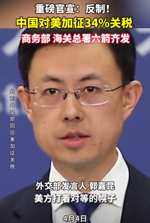 宣布自2025年4月10日起,对所有原产于美国的进口商品加征34%的关税,并同步启动11项反制措施。