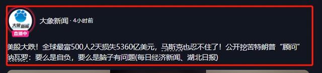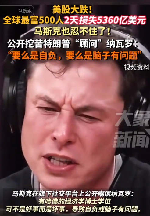 【3】2025年4月7日发布 官方媒体 大象新闻《美股大跌!全球最富500人2天损失5360亿美元,马斯克也忍不住了!公开挖苦特朗普“顾问”纳瓦罗:要么是自负,要么是脑子有问题(每日经济新闻、湖北日报)》