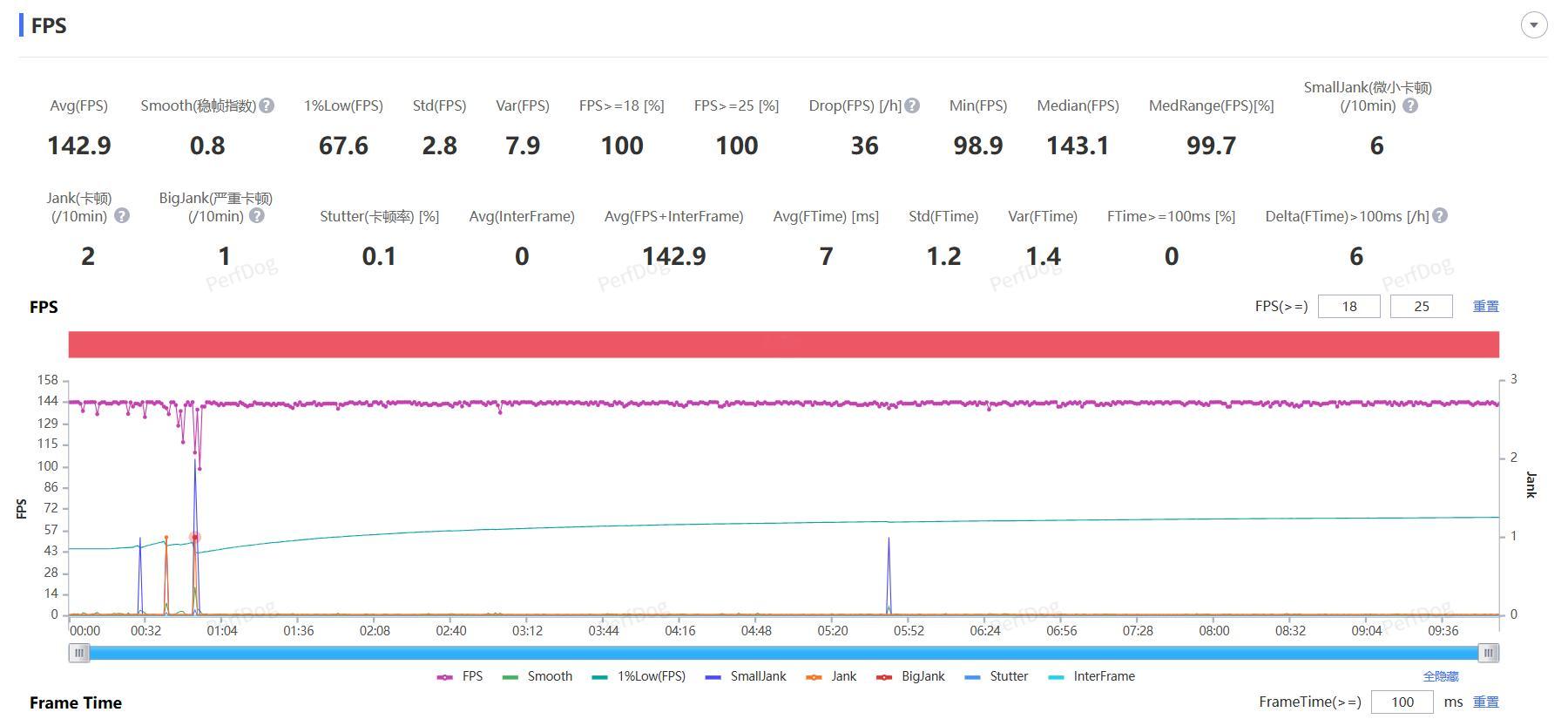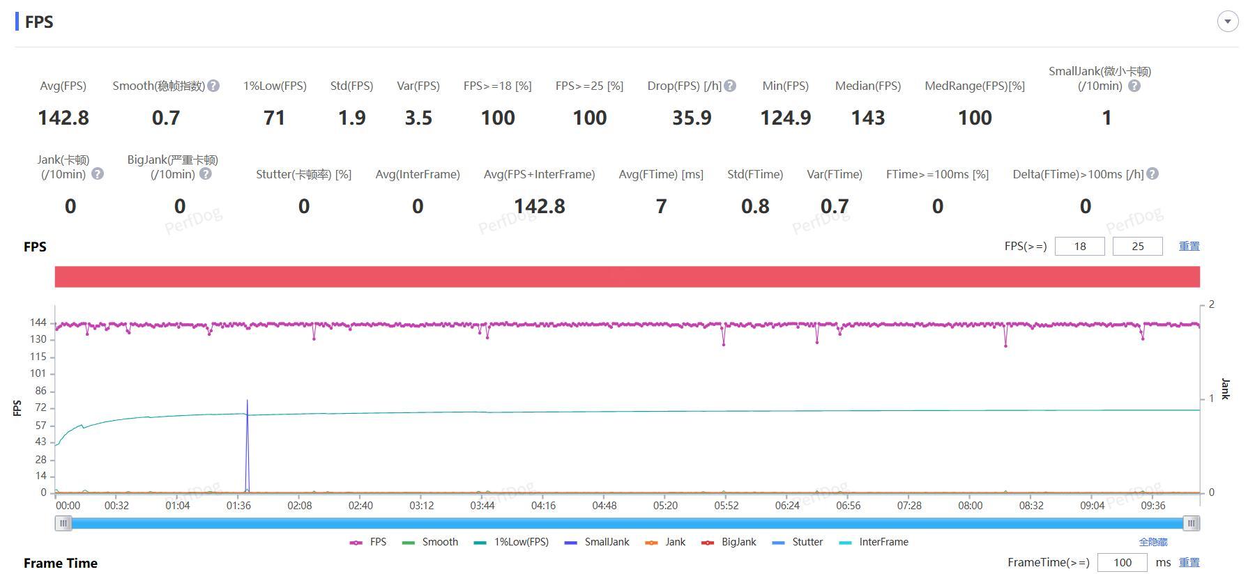 游戏方面,王者荣耀10分钟对局帧数测试,画质全拉满,全程基本稳定在142帧左右,游戏过程中操作顺滑、反馈响应及时,整体就是一个稳;