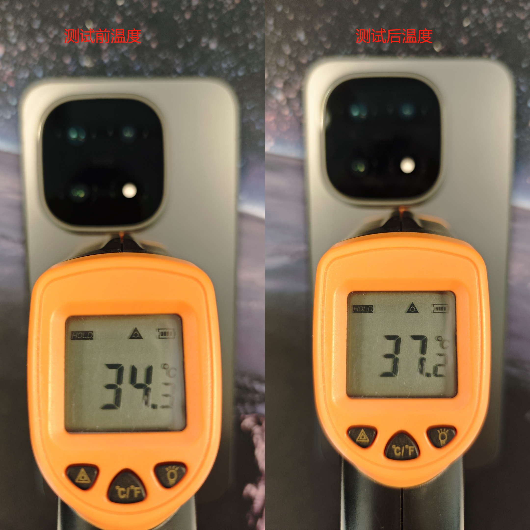 机温这块,测试前机身温度保持在34°,连续测试半个小时,测试结束后温度为37°,在画质全高且三款游戏无间断高强度进行的情况下,整体也就升温了3°多,iQOO15的散热实力确实牛X。