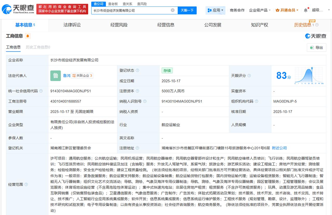长沙市低空经济发展公司成立注册资本5000万 天眼查App显示,近日,长沙市低空