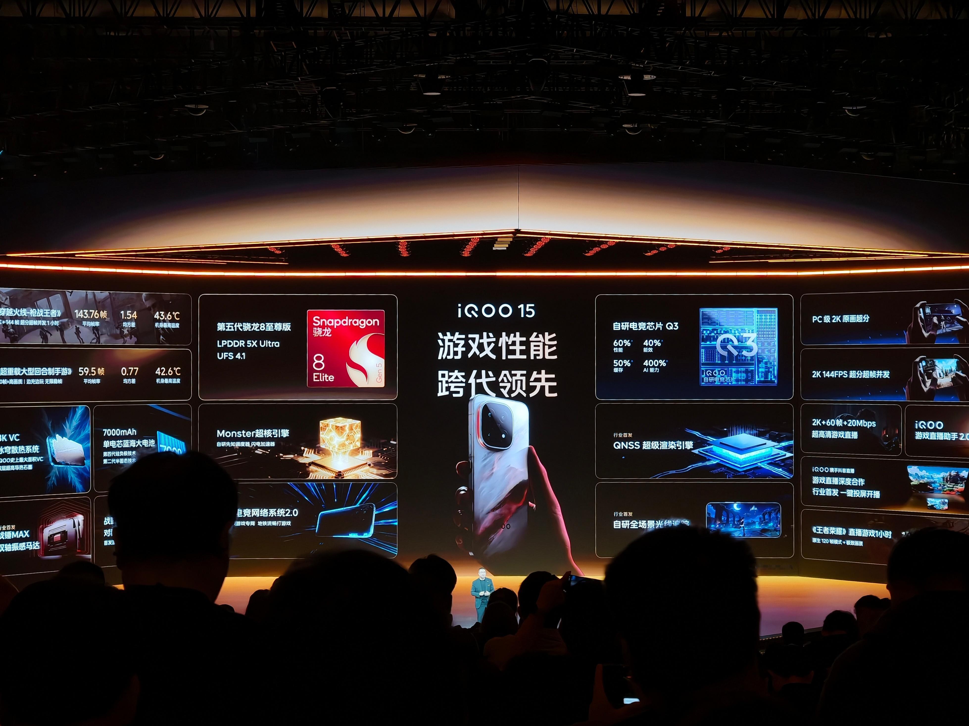 iQOO15 搭载第五代骁龙8至尊版,搭配LPDDR 5X Ultra、UFS 4.1释放满血性能;自研电竞芯片Q3+QNSS超级渲染引擎,实现全场景光追和2K+144FPS超分超帧并发。