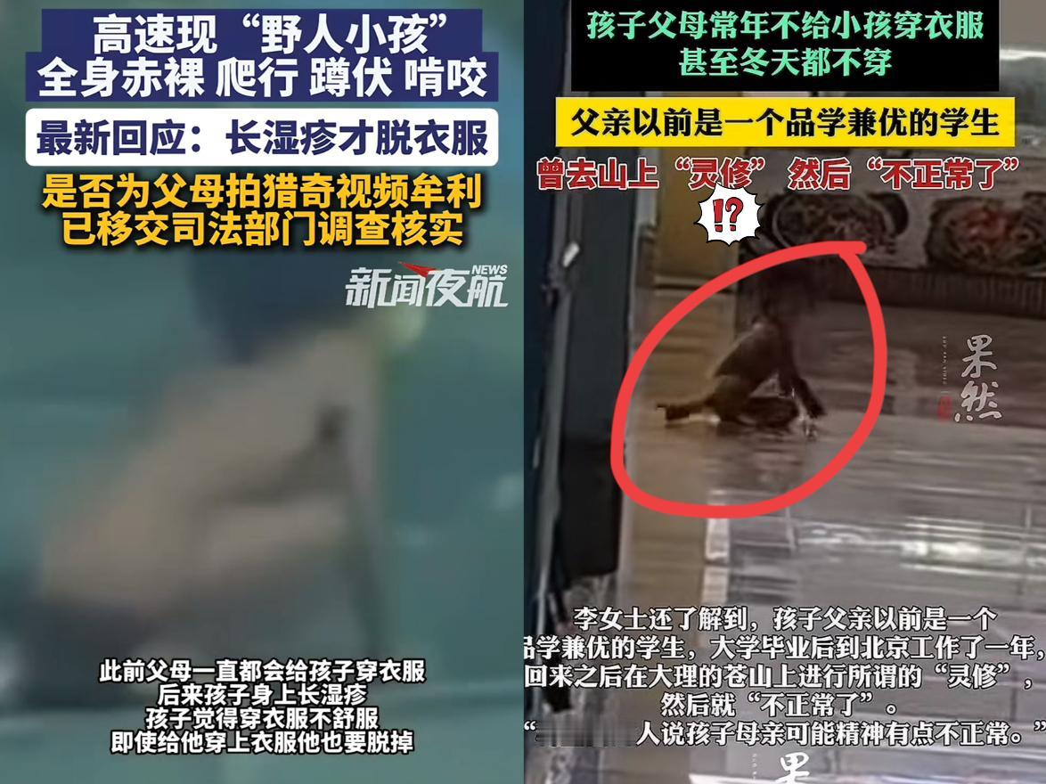 "野人小孩"父亲终于开口了! 他解释了为什么不给小孩穿衣服, 不是不给他穿,而是因为小孩 小时候经常起湿疹,还总反复,穿衣摩擦会加重病情。 可网友并不买账:孩子浑身黑得发亮,明明是常年不穿衣暴晒的样子,这说法根本站不住脚。 更别提他压根没解释,为啥三岁孩子非要爬着走,还跟狗同吃同住。 父亲的说法或许有苦衷,但公众的质疑也非空穴来风:湿疹可以选柔软布料、短时间穿衣,而非让孩子长期暴露。 我觉得比起单方面解释,不如把专业判断交给医院和相关部门,用检查报告说话。
