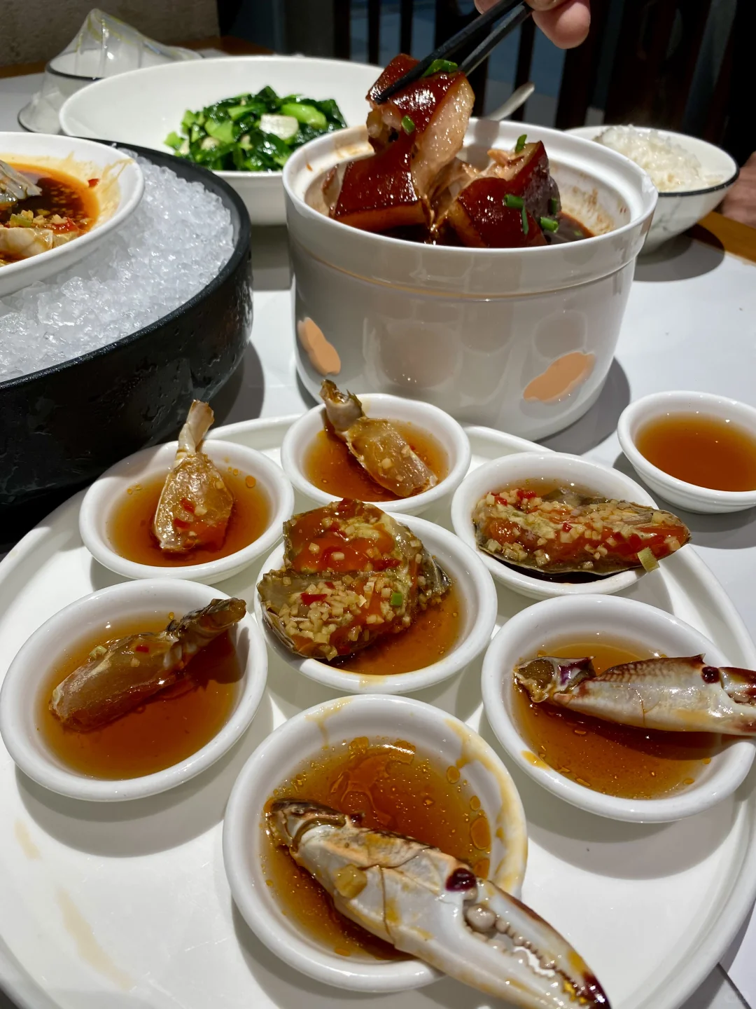 蟹被劈开腌制,夹一筷一口嘬上来,真有点冰淇淋口感,蘸点醋更赞👍