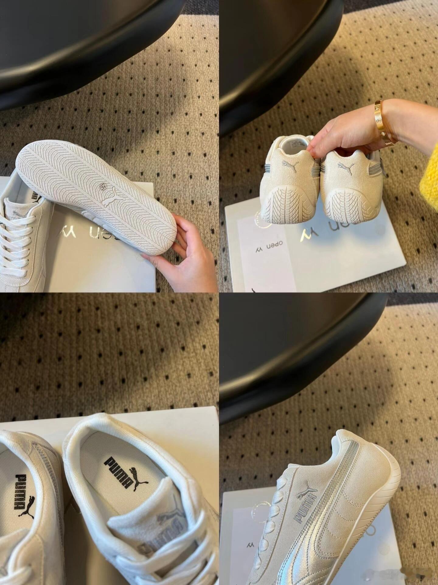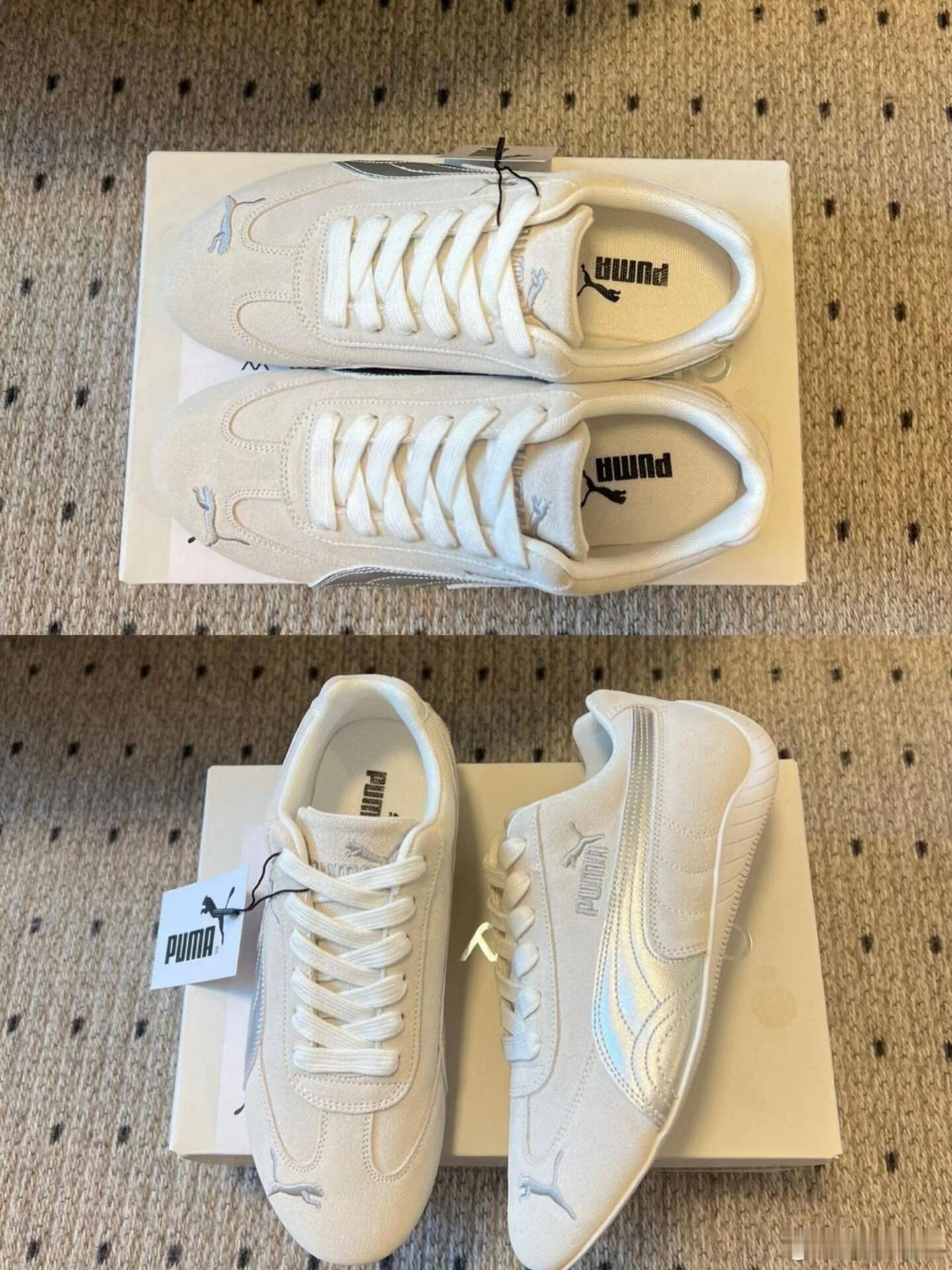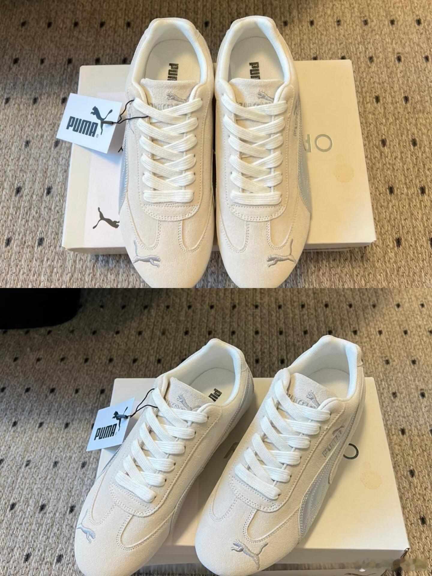 这双PUMA运动鞋以纯净的米白色为主调,采用柔软的织物与皮革拼接鞋面,营造出简约