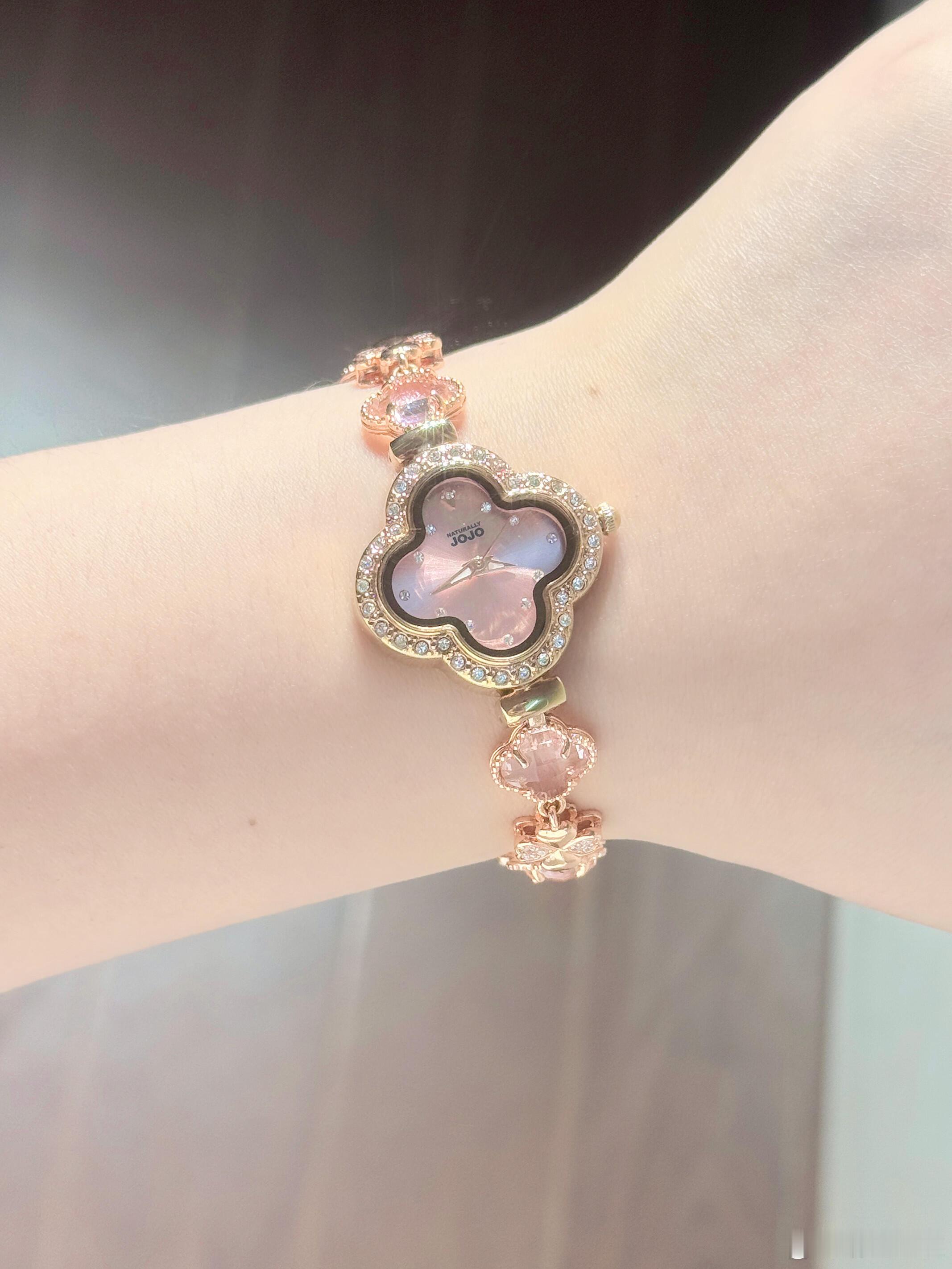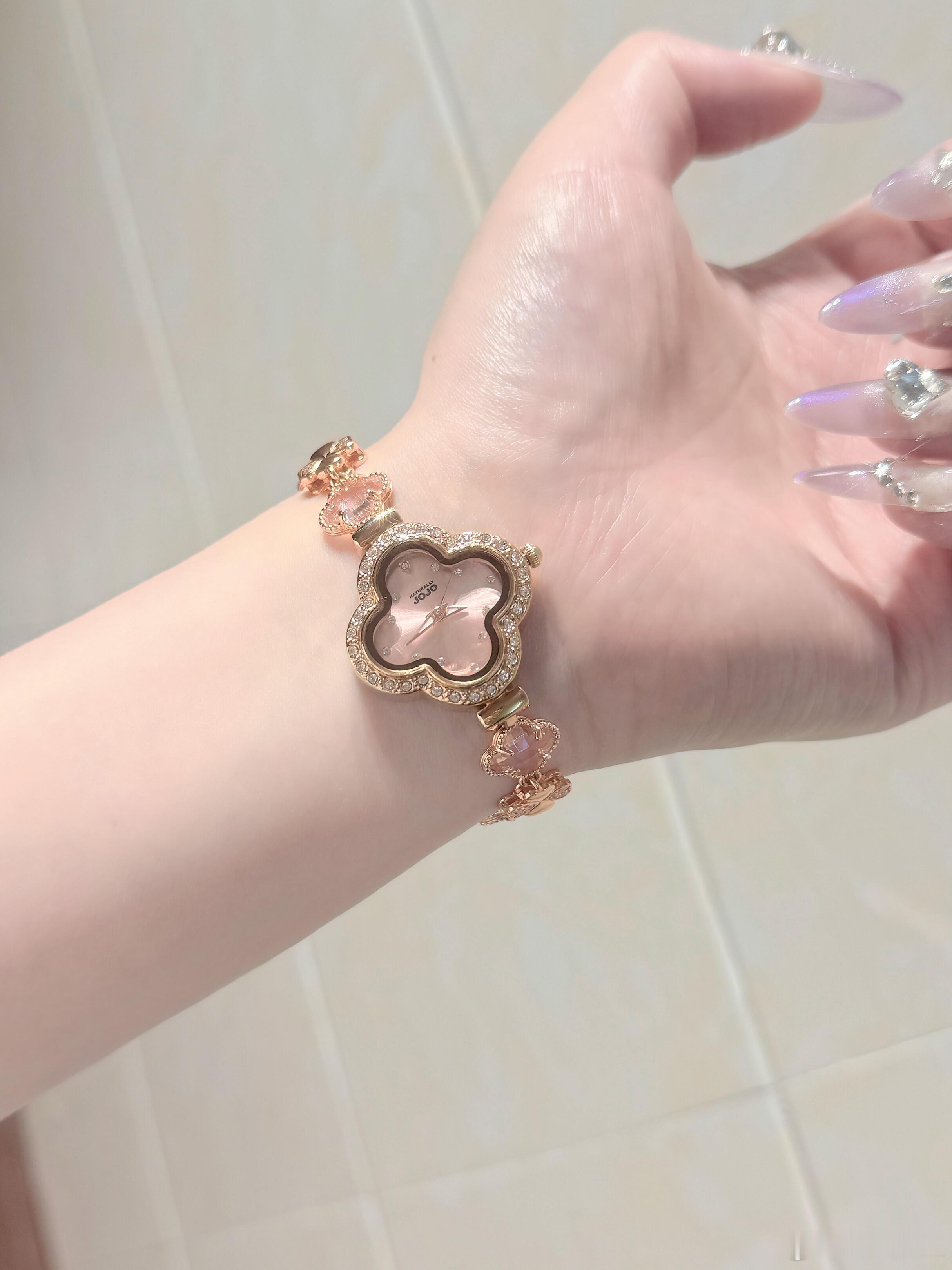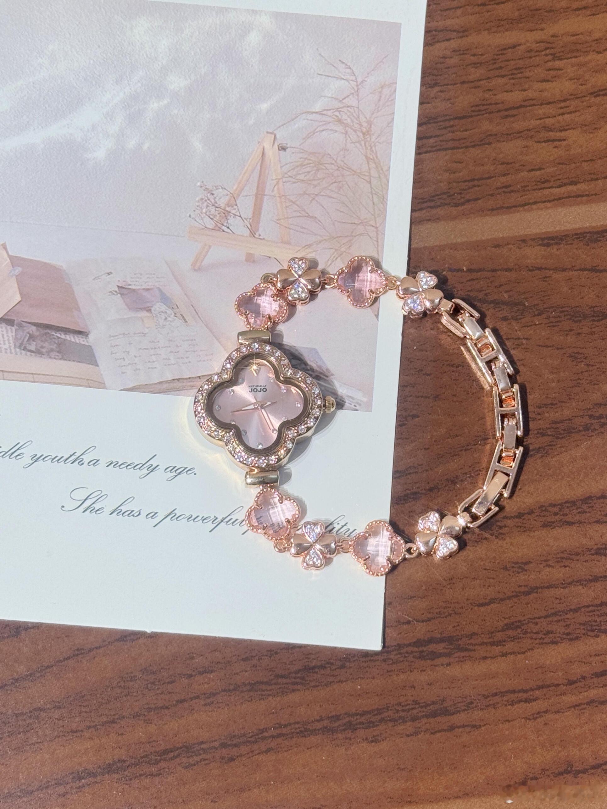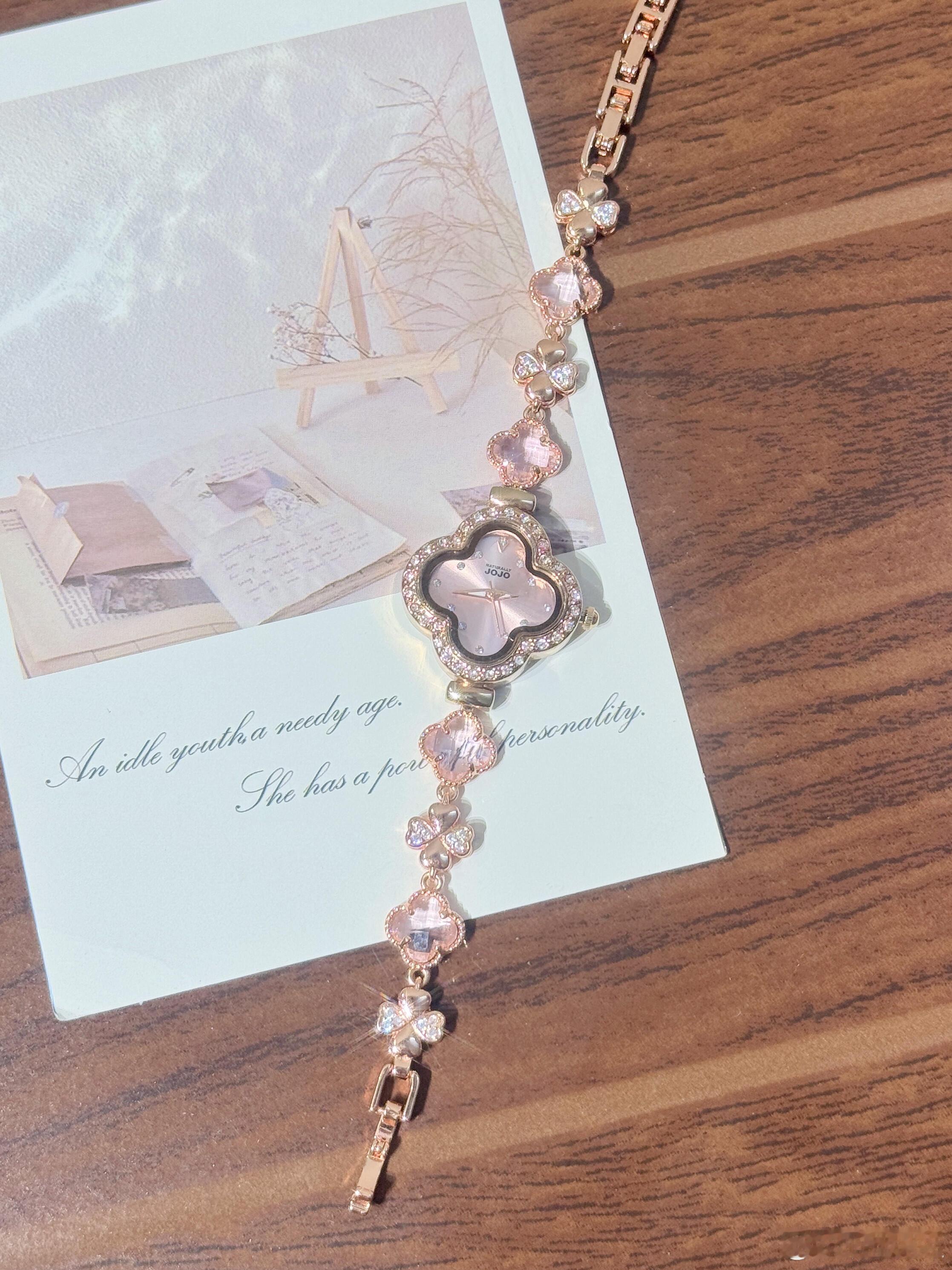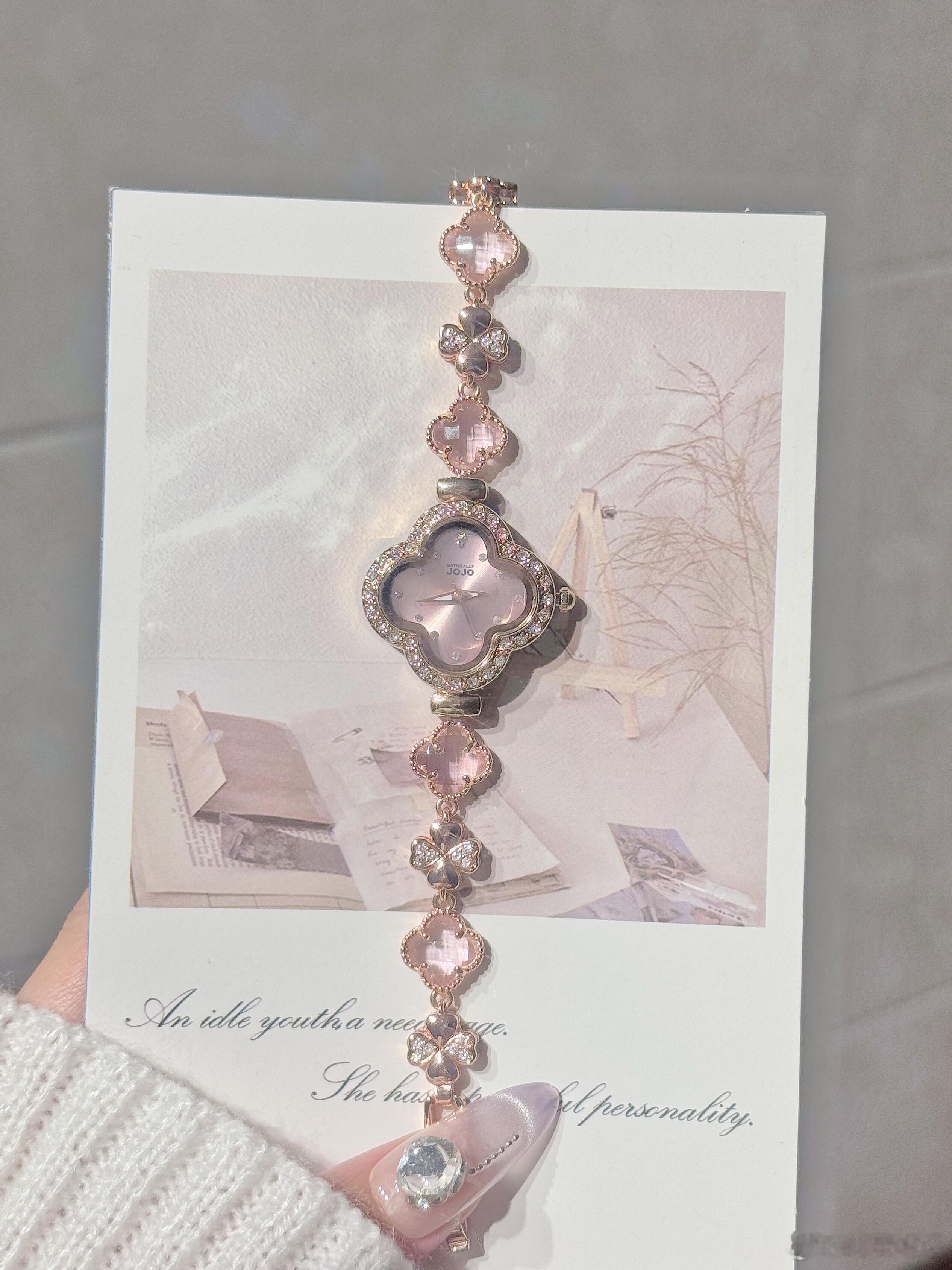 这款JOJO粉色四叶草腕表,以柔美的少女情怀为设计核心。表盘采用独特的四叶草造型
