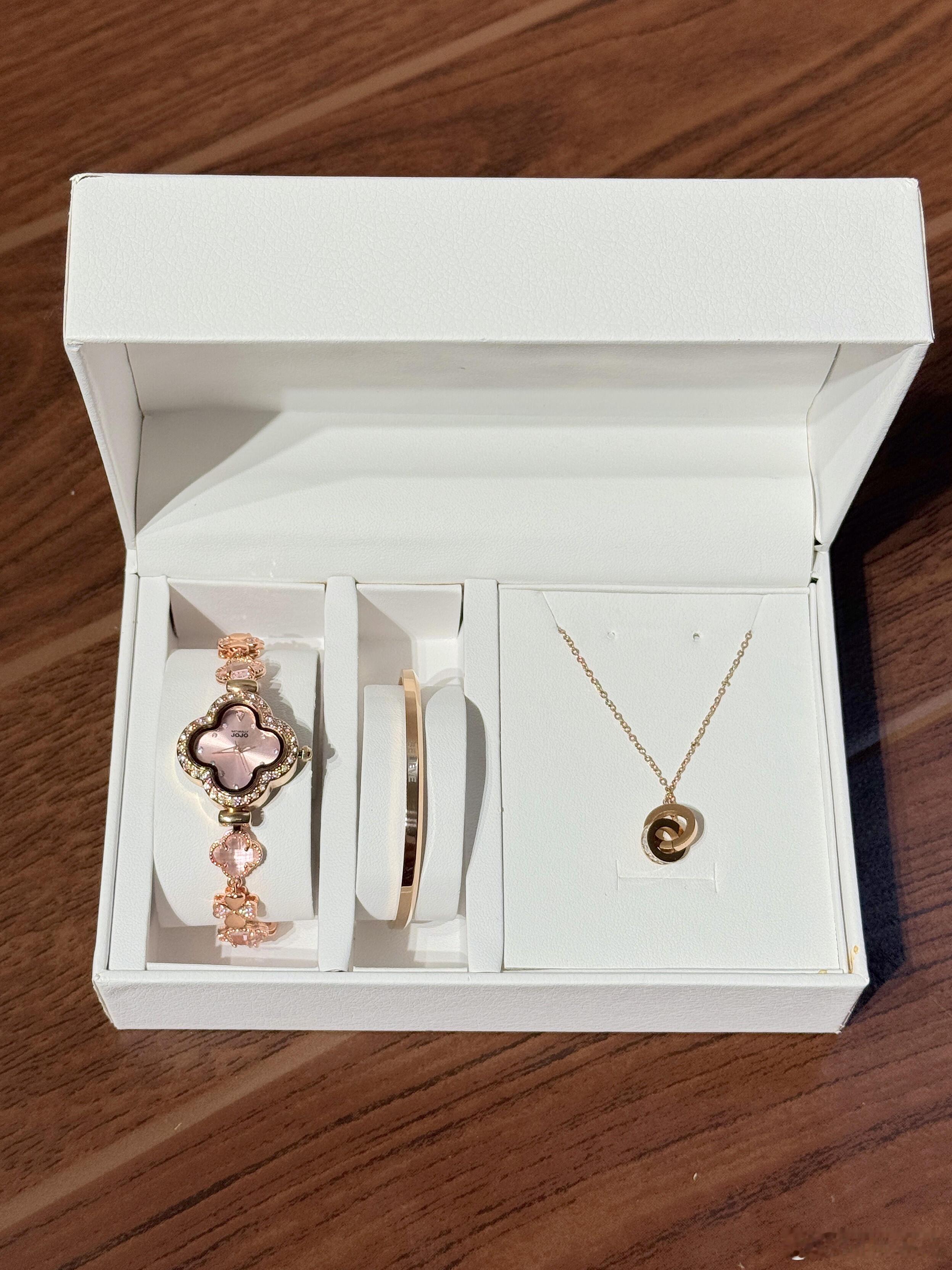 这款JOJO粉色四叶草腕表,以柔美的少女情怀为设计核心。表盘采用独特的四叶草造型,镶嵌一圈璀璨小钻,搭配玫瑰金表壳与链条式表带,尽显精致优雅。表身点缀同系列四叶草装饰,与淡粉底色呼应,寓意幸运与浪漫。纤巧表盘与灵动链条平衡了甜美与轻奢感,无论是日常佩戴还是搭配裙装,都能为手腕增添一抹灵动光彩。整体设计完美融合了少女的梦幻与珠宝的细腻,是一款兼具寓意与美感的时尚配饰。时尚配饰