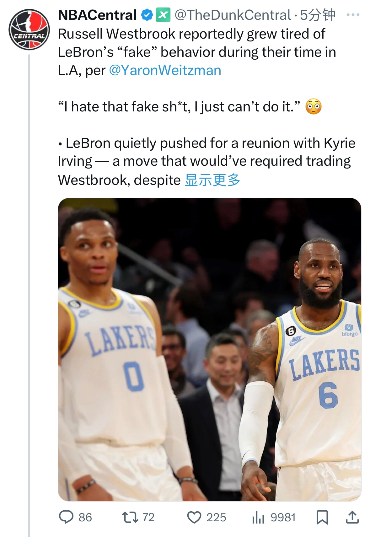 边角料Yaron Weitzman:威斯布鲁克在湖人效力期间,逐渐厌倦了勒布朗的“虚伪”行径。