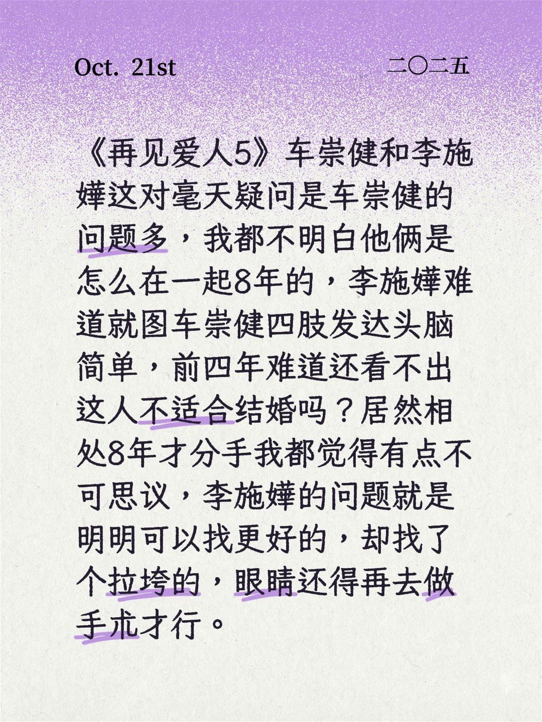 我评论了@刘哔电影 的作品: 《再见爱人5》车崇健和李施嬅这对毫天疑问是车崇健的问题多,我都不明白他俩是怎么在一起8年的,李施嬅难道就图车崇健四肢发达头脑简单,前四年难道还看不出这人不适合结婚吗?居然相处8年才分手我都觉得有点不可思议,李施嬅的问题就是明明可以找更好的,却找了个拉垮的,眼睛还得再去做手术才行。再见爱人5 再见爱人 李施嬅 车崇健
