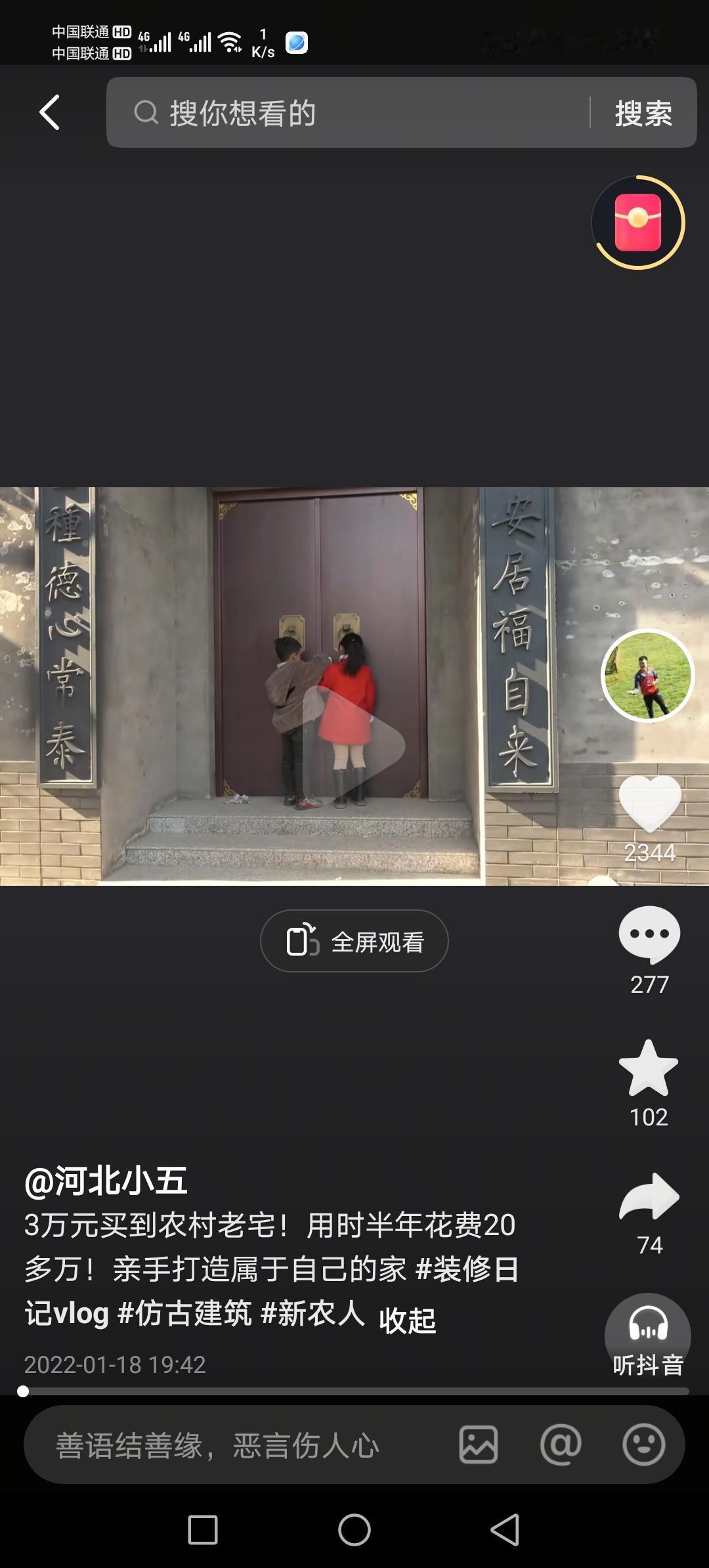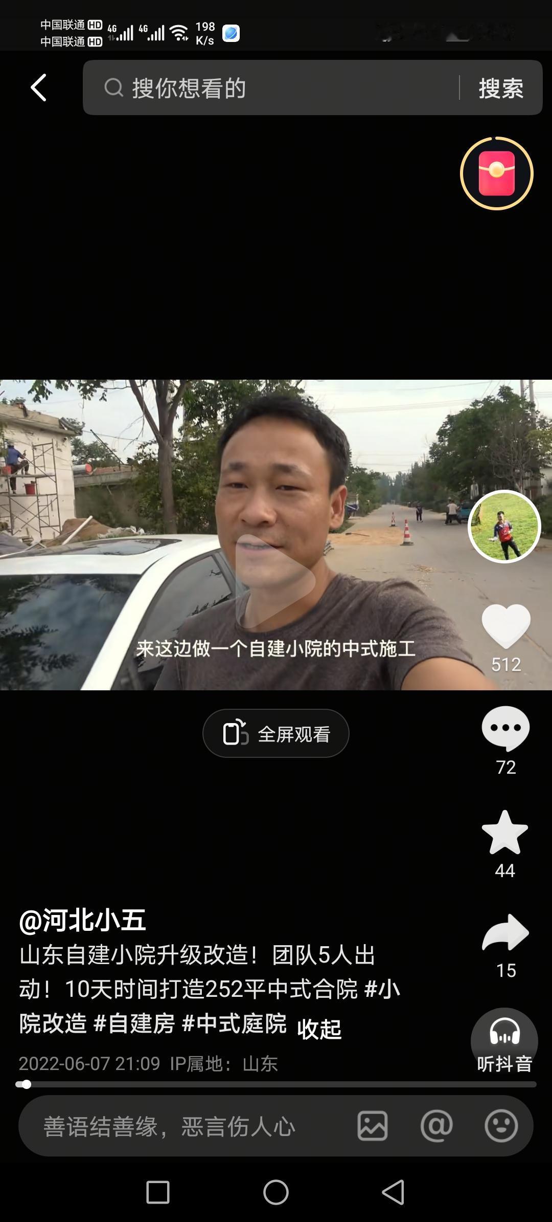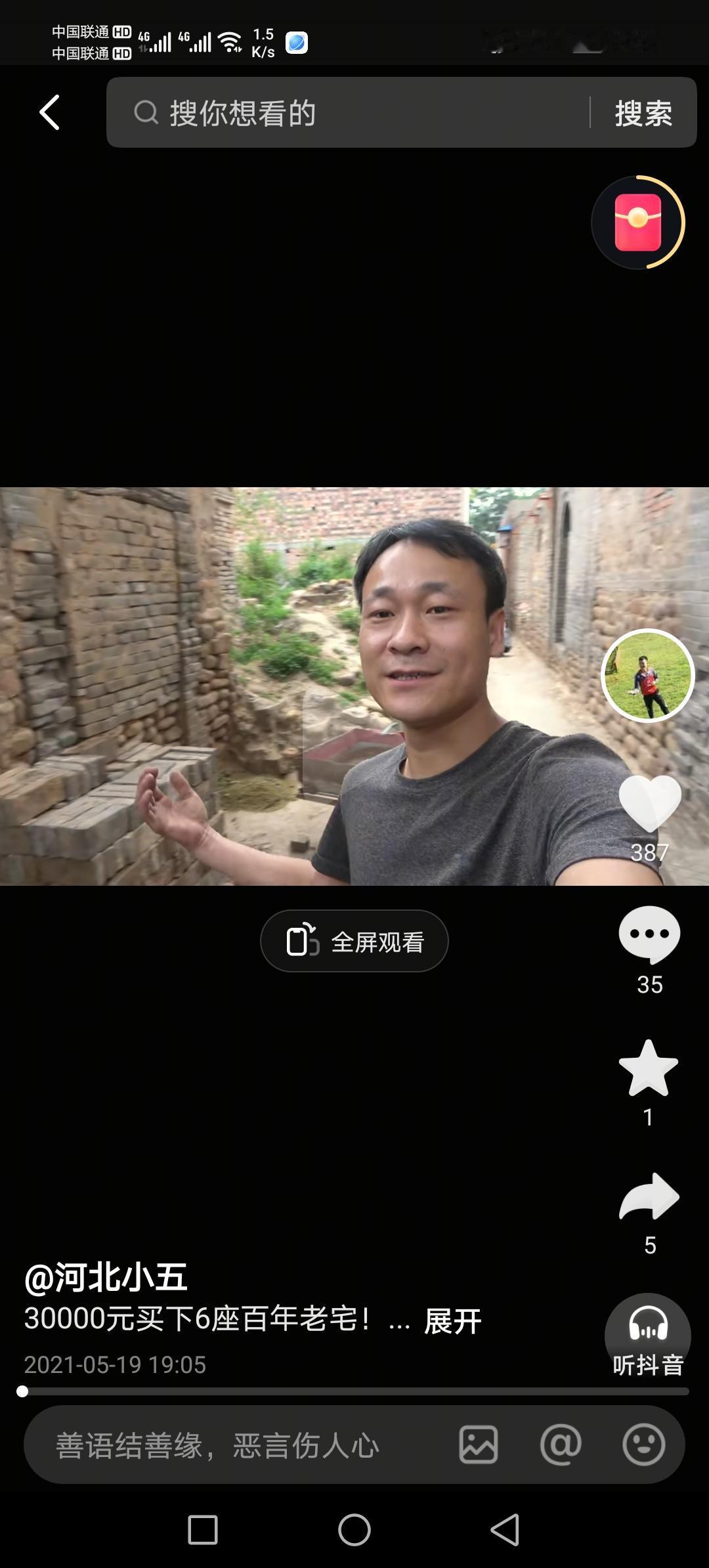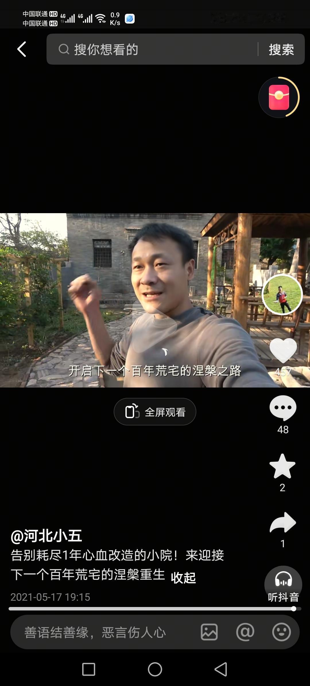河北小五,本是邯郸涉县一个普普通通的庄稼人,最早的视频是大概在18年7月份开始,拍的内容也比较杂,直到2020年疫情开始,他忽发奇想改造农村小院,关注的人多了起来。 他买的第一个小院,是自己村的,花了3000块钱。改造也很简单,用砖头铺了地面,刷白了墙壁,院子里栽上树木花草,就地取材用卵石砌了小路,垒了墙头,精心做了一个照壁凉亭和大门。 就是他改造小院的视频,发布于2020年5月26日,播放量突破了215万,留言近8万,转发3万多,收藏2万多! 这个视频的爆红给了小五信心,他接着在村子里花3万买了几个小院,花20多万重点打造了一个样板,逐渐有了名气,开始走出邯郸,直至走到了北京!!!