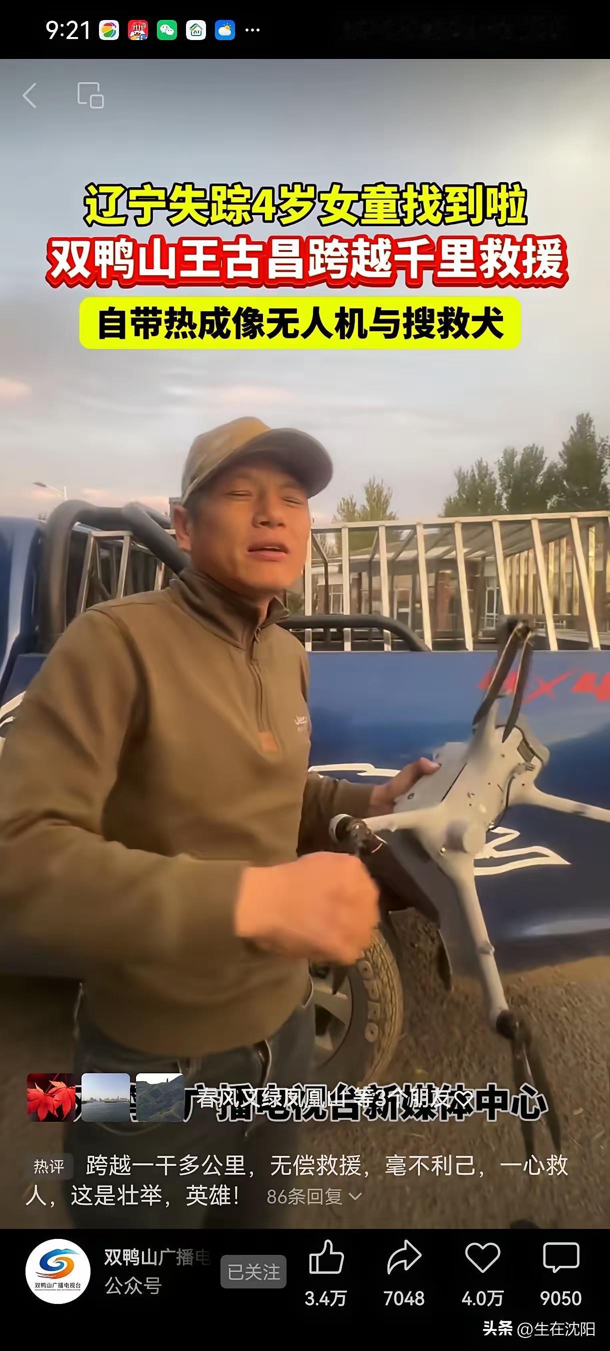 双鸭山王骨昌,平民英雄,这是个黑龙江人,带个热成像,三个无人机,飞了四块电池找到的。并且他得到消息开了十几个小时的车还带了只搜救犬。东北从来不缺仗义英雄。向英雄致敬英雄致敬。 —— 王骨昌赶到山脚那天,后半夜两点,风跟刀片似的。他把车往雪堆旁一横,打开车门,搜救犬“坦克”蹦下来,鼻子往风里一嗅,尾巴绷成铁棍。老王拍了拍它脑袋:“兄弟,今晚靠你了。”话音没落,他自己先打了个趔趄——一路从哈尔滨干过来,十几个小时,泡面都没顾上吃,腿都木了。 现场已经聚了不少人,警察、消防、村民,手电筒把雪地照得跟白昼一样,可林子太大,喊破嗓子也没回声。失踪的是个十六岁男孩,下午跟家里吵架,一气之下跑进大山,手机关机,羽绒服还是薄的。山里零下二十多度,谁都知道,时间拖不起。官方无人机电池耗尽,救援队体力见底,指挥员嗓子沙哑:“谁还能上?”老王举手:“我来!” 他从后备箱拎出自己家伙:一架挂着热成像的M300,两架备用机,外加四块沉甸甸的电池,像拎出四块金砖。旁边村民看得直咧嘴:“这啥新鲜玩意儿?”老王嘿嘿一笑:“千里眼。”说话间,他先把热成像机升空,屏幕里一片蓝绿,红点代表活物。第一圈扫完,全是野兔、野鸡,红点小得可怜。第二块电池上去,雪开始下,能见度掉成渣,老王干脆把机器调到高灵敏度,自己蹲在车里啃两口冻得硬邦邦的面包,眼镜片上一层雾,他拿袖子一抹,接着盯屏幕。 第三块电池快耗完时,屏幕边缘忽然闪出一个稍大的红影,缩在半山腰的岩石缝里,一动不动。老王心脏砰砰跳,赶紧换角度,拉近一看:人形,抱膝,体温明显低于正常,但还有气!他立马冲外面喊:“西南三百米,石砬子下面!”坦克听懂了似的,嗖地窜出去,救援队员跟在后面,深一脚浅一脚往山上扑。十分钟后,对讲机里传来哭声:“找到了!人还活着!”那一刻,老王把第四块电池往地上一扔,整个人瘫在雪里,笑得跟傻子一样。 男孩被抬下山,嘴唇青紫,手指冻得掰不开,医生说再晚半小时,命就悬了。孩子父母扑通跪在老王面前,他慌忙往旁边躲:“别整这出,我受不起。”其实他心里门儿清:自己也是个父亲,女儿才九岁,要是哪天她跑丢,他也盼着有人这么玩命找。东北人说话直,感情也直,一句“受不起”,把眼泪硬生生憋回去,转身却悄悄抹眼角。 天蒙蒙亮,老王收拾机器,准备往回赶。村民围着问:“老哥,你图啥啊?油钱、电池、过路费,得好几千。”老王咧嘴一乐:“图啥?就图咱黑龙江不丢孩子。”说完钻进车,发动机轰一声,像给雪山打了个招呼。车尾灯消失在雾里,众人这才反应过来——连他姓啥都没问清楚,只记住了“双鸭山老王”。 故事传开,网上热搜挂了一天。有人夸他“平民英雄”,有人给他算成本:“四块电池两千多,油钱过路费再两千,还不算机器折旧。”老王刷到评论,在下面回复得朴实:“钱算个屁,孩子回家比啥都值。”一句话,又把网友整破防。可他也坦言,其实后怕:“雪再大点,机器掉山里,我一年工资打水漂;找不到人,我也得抑郁。”英雄不是没恐惧,而是恐惧之后仍选择往前一步。 我老家也在东北,小时候走丢过,是邻居大爷骑自行车满城找,才把我送回家。我妈常说,东北天寒地冻,可人心热,再大的雪也压不住。老王这事让我信了——仗义不是电视剧里飞天遁地,就是一个普通人,把家里机器拖出来,连夜跑几百里,用四块电池换一个少年的命。以后我若在外地混不下去,就回老家,学学老王,考个无人机驾照,万一也能救个人,比写十篇鸡汤都带劲。 当然,也有人酸:“就爱出风头,有本事捐所学校。”我觉得吧,捐学校是慈善,把快冻死的孩子拖回来是救命,两条道都好人走,没必要踩一捧一。再说,老王花的可是真金白银,时间、油钱、机器损耗全自己扛,政府给的奖金他一分没要,全捐给当地救援队,让他们买新装备。这操作,比键盘侠敲两下字实在多了。 老王后来接受采访,被问到“以后还干不干”,他搓着手笑:“干啊,只要腿还能踩油门,机器还能飞,就得出份力。”镜头里,他脸被风吹得通红,褶子里夹满雪碴,可眼神亮得吓人,像山里最干净的那束光。看完我懂了:英雄不是标签,是选择;东北最硬的也不是冰,是人心。 各位读者你们怎么看?欢迎在评论区讨论。