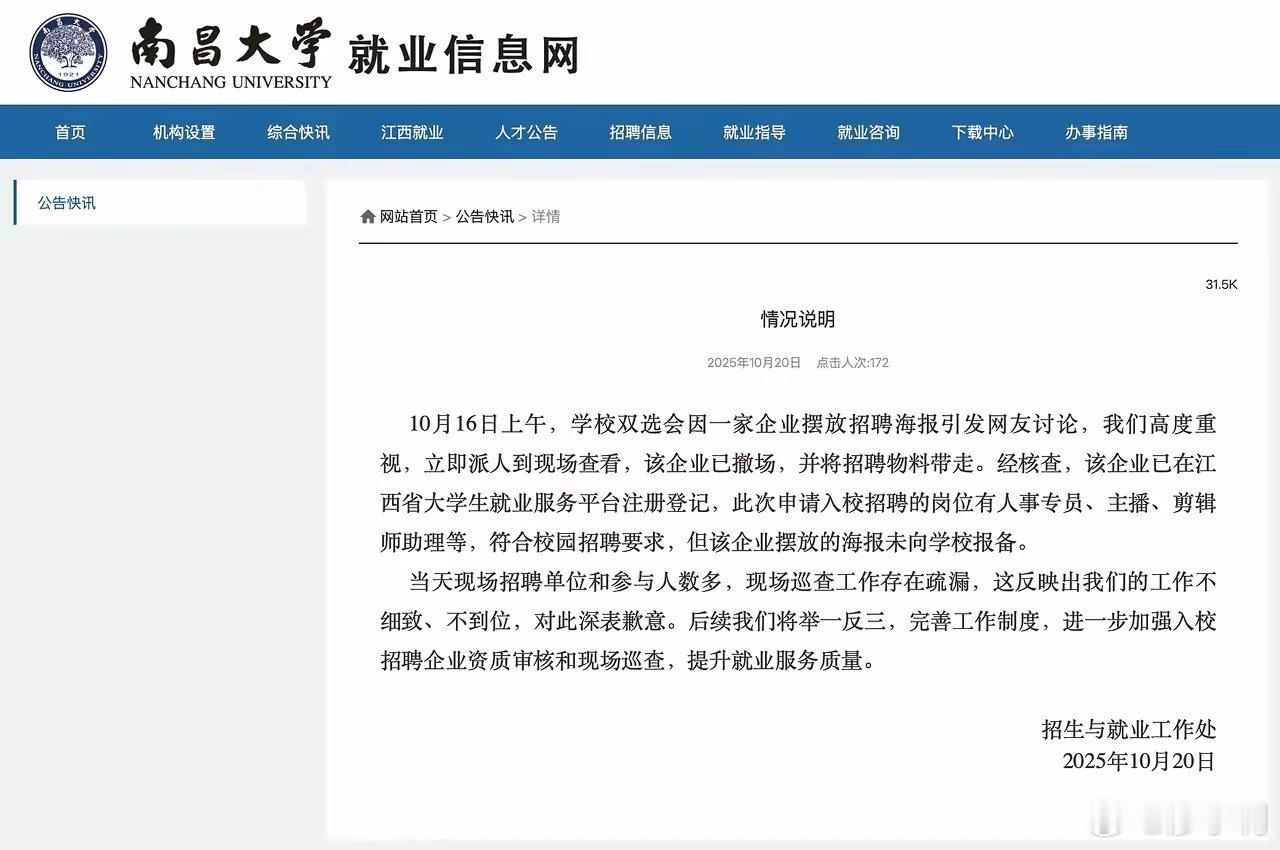 南昌大学致歉出现这种情况,其实大家都心知肚明,无非是这家企业胆子大了一点,直白了一点而已。幸亏现在有了网络,没有网络舆论,估计这家公司会神不知鬼不觉的在南昌大学所有教职工面前完成招聘任务。校方反应倒是挺快,第一时间直接发声明道歉。这也给所有高校提了个醒,任何一家企业进入高校招聘,高校都应当有一套严格审查程序,这个审查不仅仅是资质审查,还要现场巡查。热点观点