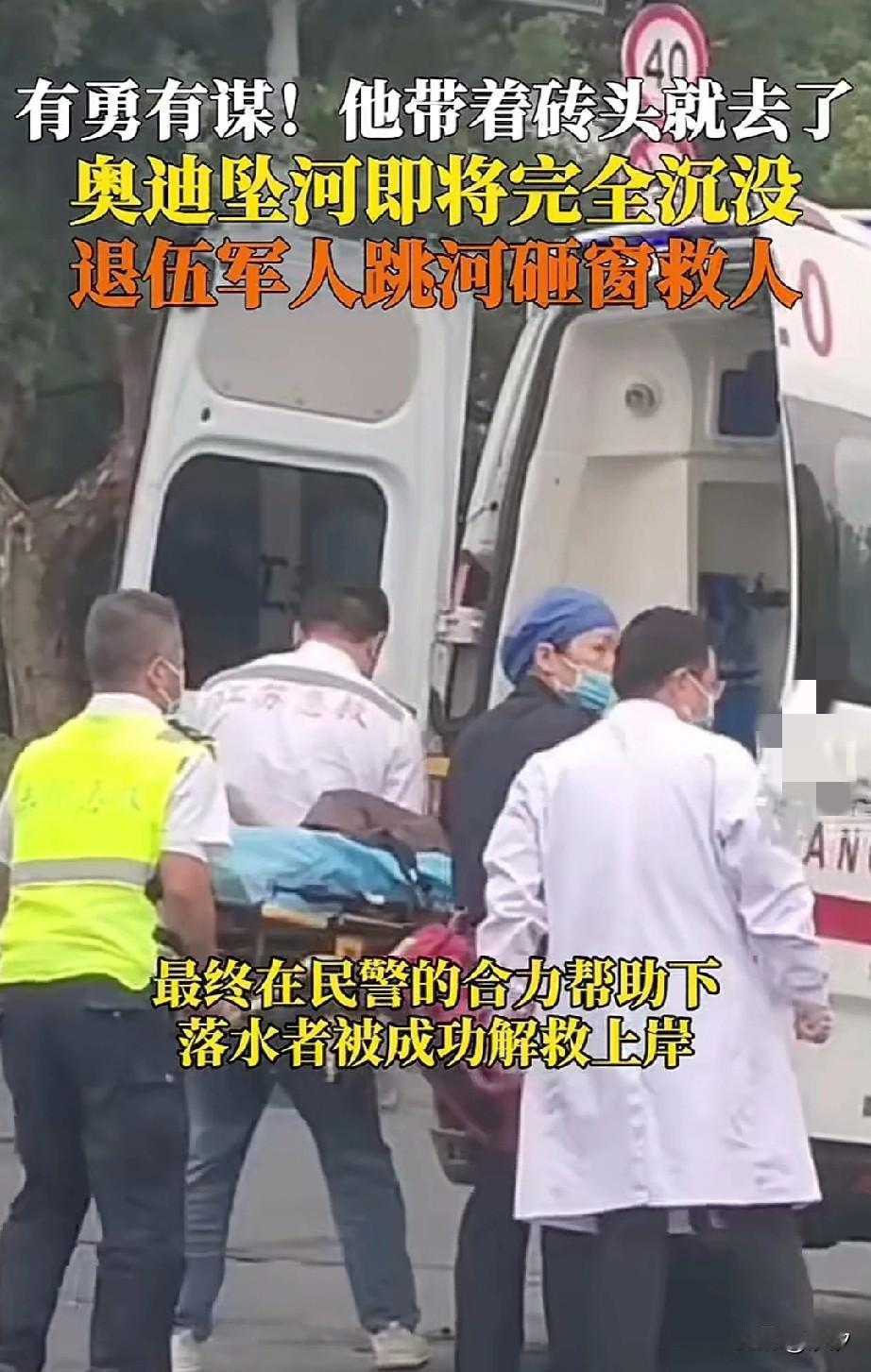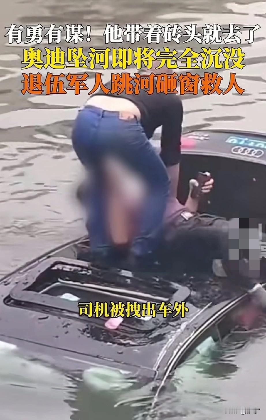 近日奥迪司机开车不小心冲入河中, 司机慌了急得打不开车门, 后门打开了却出不去, 眼看着车顶已经没入水中, 绝望之际有人冲入河中, 手中还拿着砖头, 原来是一名退伍军人, 退伍不褪色, 他游了过去, 爬上轿车车顶, 那石头狠狠砸去, 连着砸了十几次, 终于把天窗砸破了, 用手把碎玻璃清了清, 就拉住绝望的司机, 车内的司机浑身颤抖, 应该是在河水里泡太久了, 又冷又紧张浑身发抖, 随后有人扔过来了救生圈。 退伍军人安慰死里逃生的司机, 给他套上游泳圈, 自己跳入水中拉着游泳圈, 把他托上了岸, 赶来救护车把司机拉走了! 退伍军人安排好司机默默离开了, 这就是军人的含金量。 他能跳河救人明星刘奕畅能做到吗? 看到演员刘奕畅居然殴打现役军人, 不可饶恕,应该从严处理, 军人的尊严不容践踏, 他们是我们最后的底线! 大家觉得是否应该严惩殴打军人的演员刘奕畅吗? 救人一命,会有福报吗? 退伍军人 刘奕畅 车陷进河里 奥迪塌陷 坠河车 成都宝马掉河里