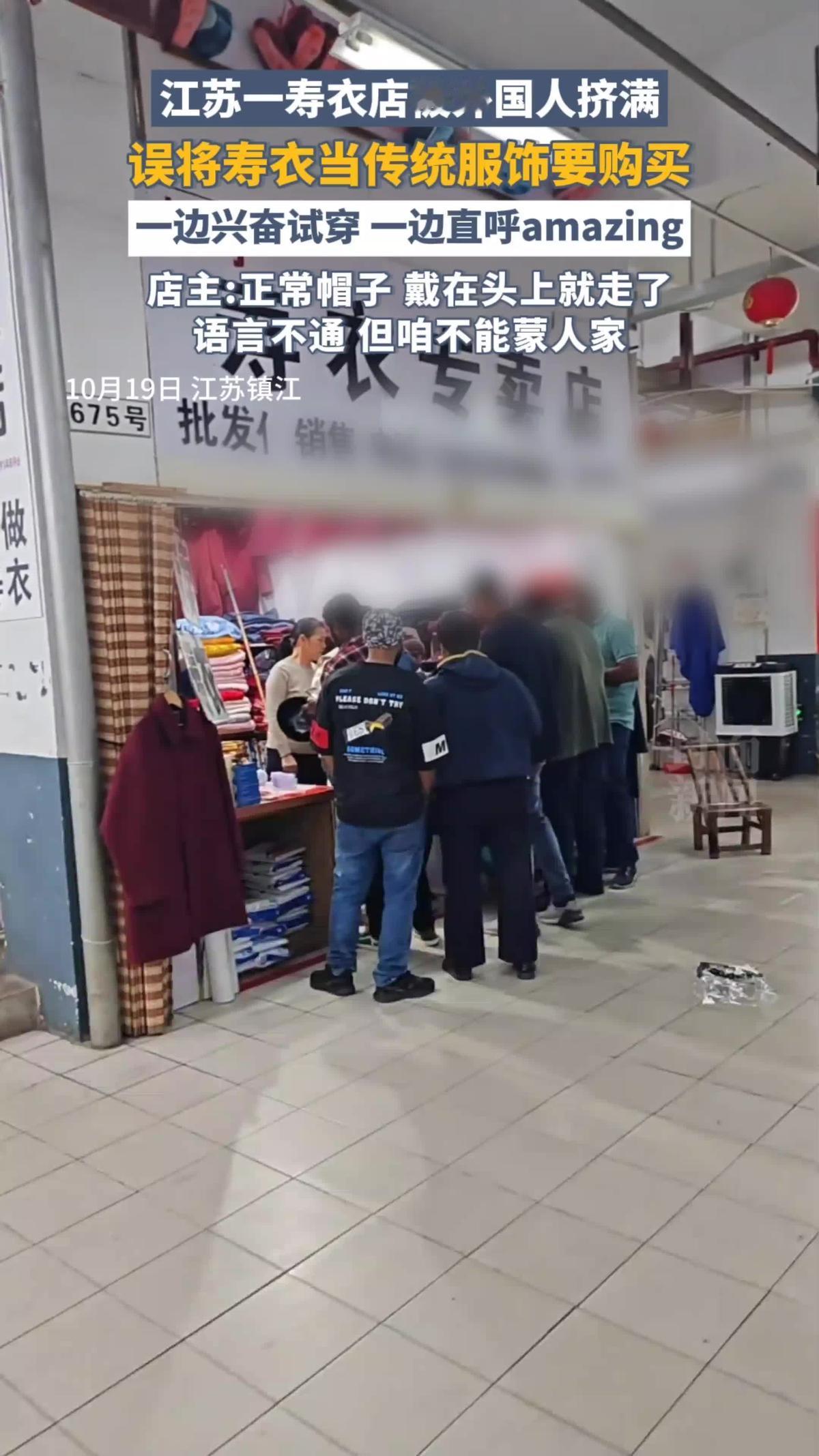 “洋相,还得洋人出!”10月19日,江苏镇江一寿衣店被多名外国人挤满,他们误将寿