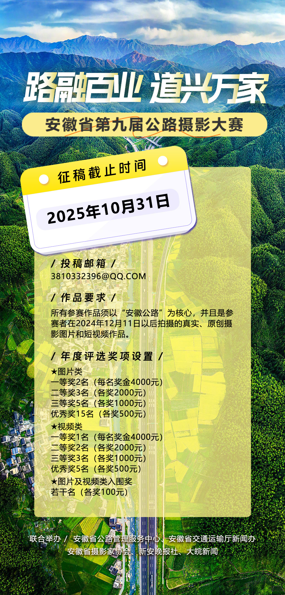 【10月31日截稿!安徽省第九届公路摄影大赛邀您尽快投稿】“路融百业 道兴万家”安徽省第九届公路摄影大赛将于10月31日正式截稿。投稿邮箱:3810332396。作品征集已进入最后冲刺时段,广大摄影爱好者快来投稿,赢取4000元现金大奖吧。
