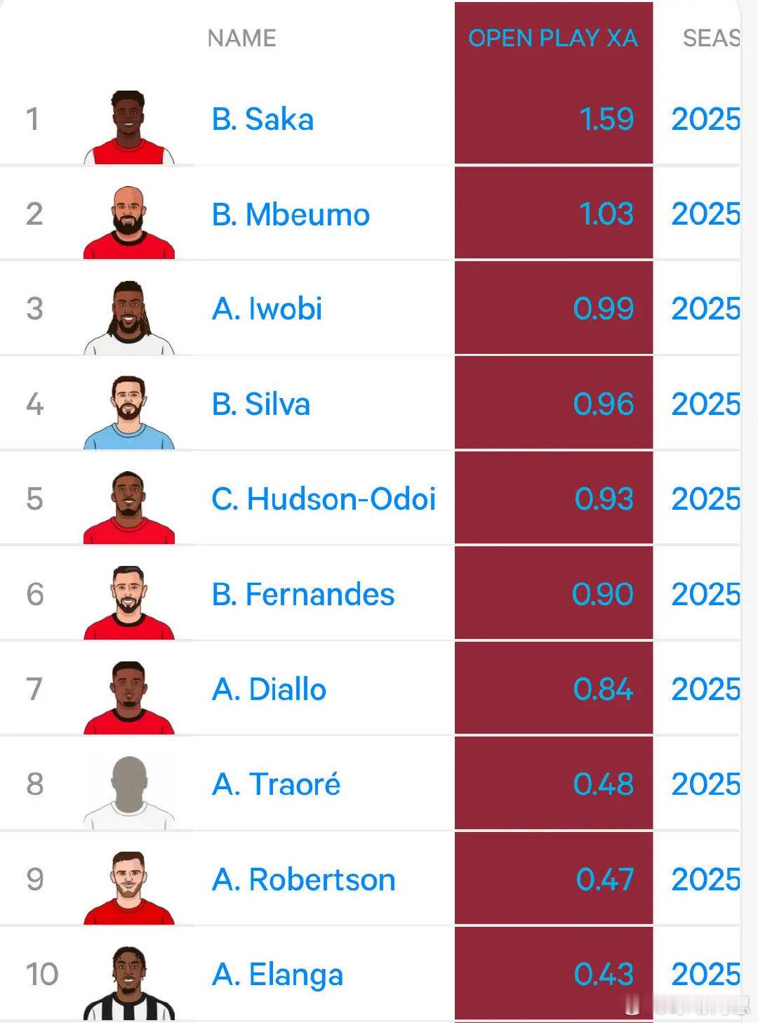 萨卡虽然只踢了400分钟的足球,但在公开赛助攻榜(Open Play XA)上却排名第一。