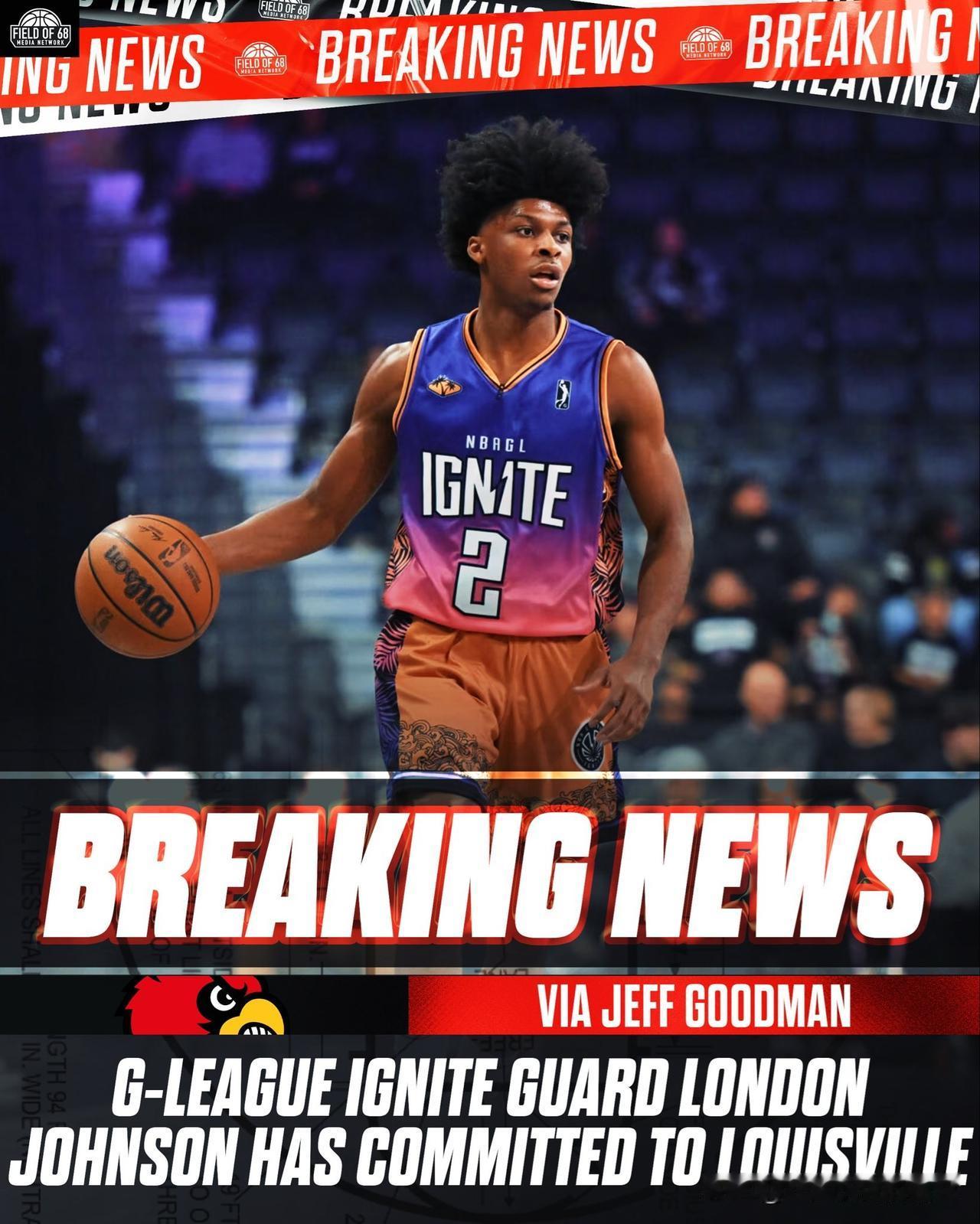 G联赛21岁控卫London Johnson宣布承诺NCAA男篮 路易维尔大学,上赛季在缅因红爪Maine Red Claws和克利夫兰冲锋队Cleveland Charge打球,他将在季中加入红雀然后红衫,直到2026-27赛季再上场,预计还有两年的大学资格,2022届高中生,曾签约加盟点燃队。
