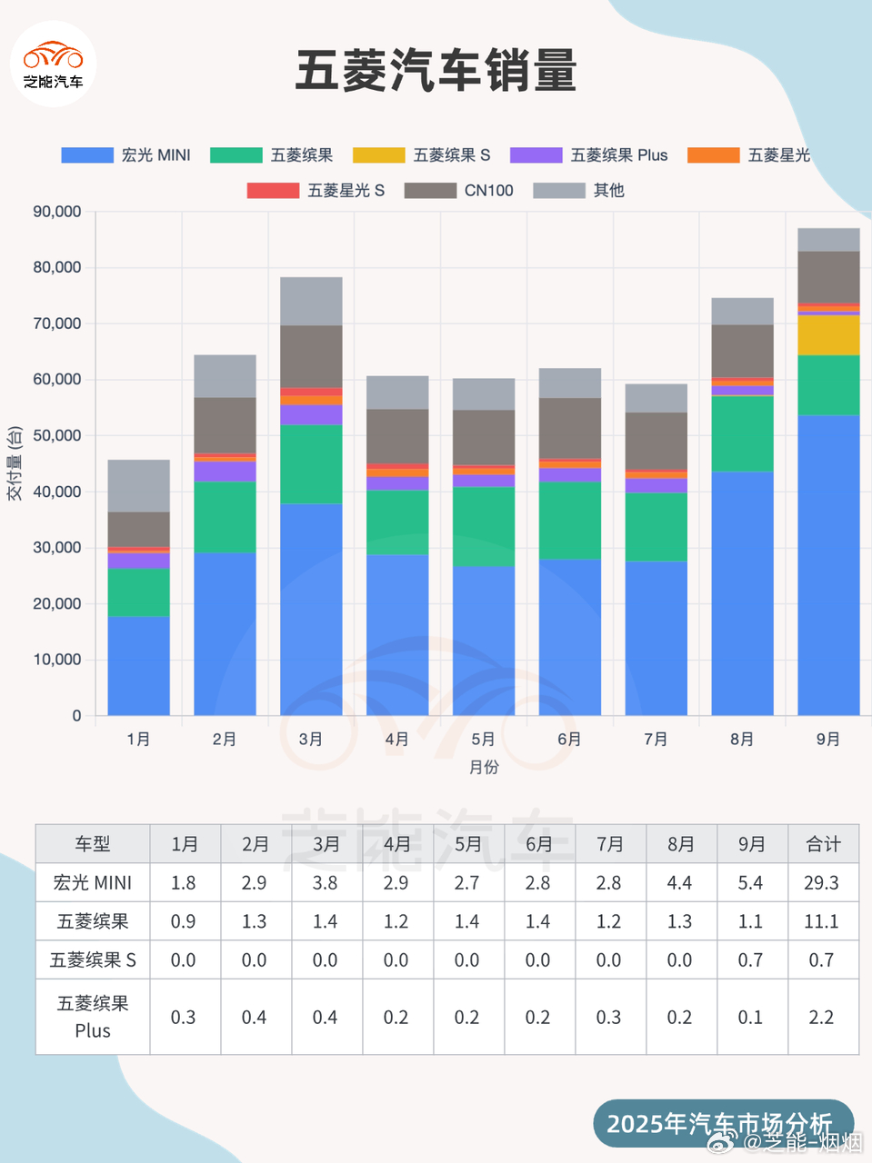 2025 年 9 月纯电小车销量亮眼,五菱表现突出,其品牌终端销量占比极高,宏光 MINI 以超半数销量领跑市场,且从 3 月起销量持续反弹,9 月达峰值。