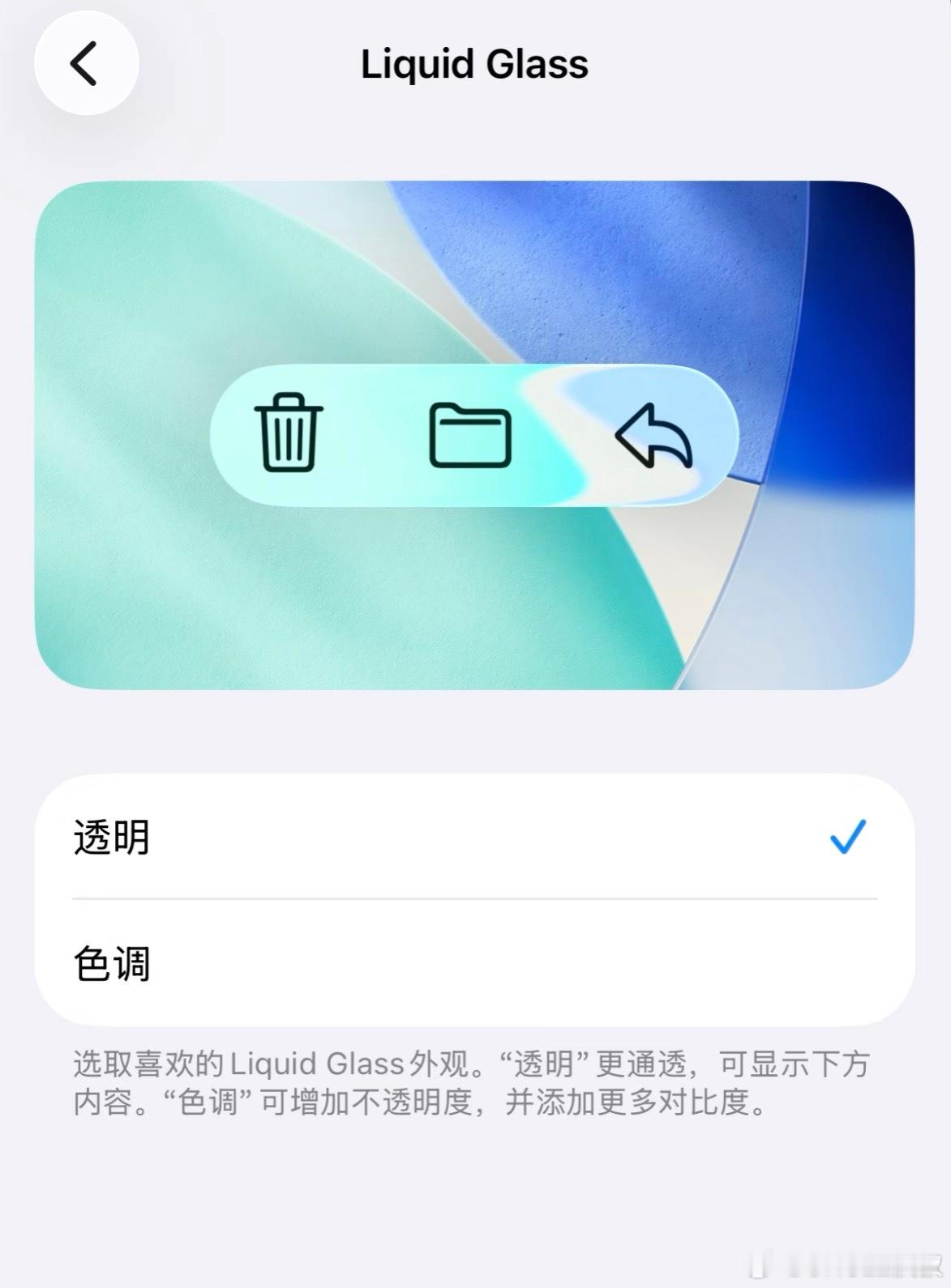 -新增了透明度的选项,有「透明」和「色调」可选。在「设置- 显示与亮度」中可自行调整 Liquid Glass效果。