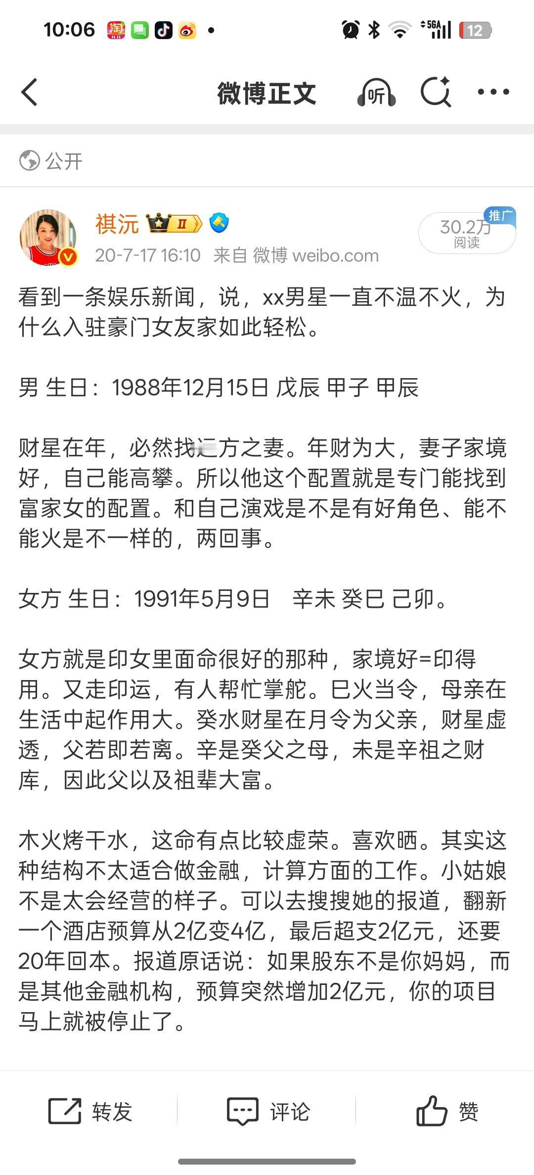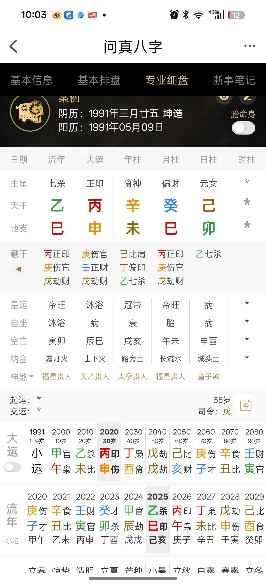 但是癸卯年结婚从他的盘看挺奇怪,只能说印到了。从他的妻子命盘当中,23癸卯年确实是结婚应期,但从他的命盘当中,癸卯是个正宗破财耗财的年份。
