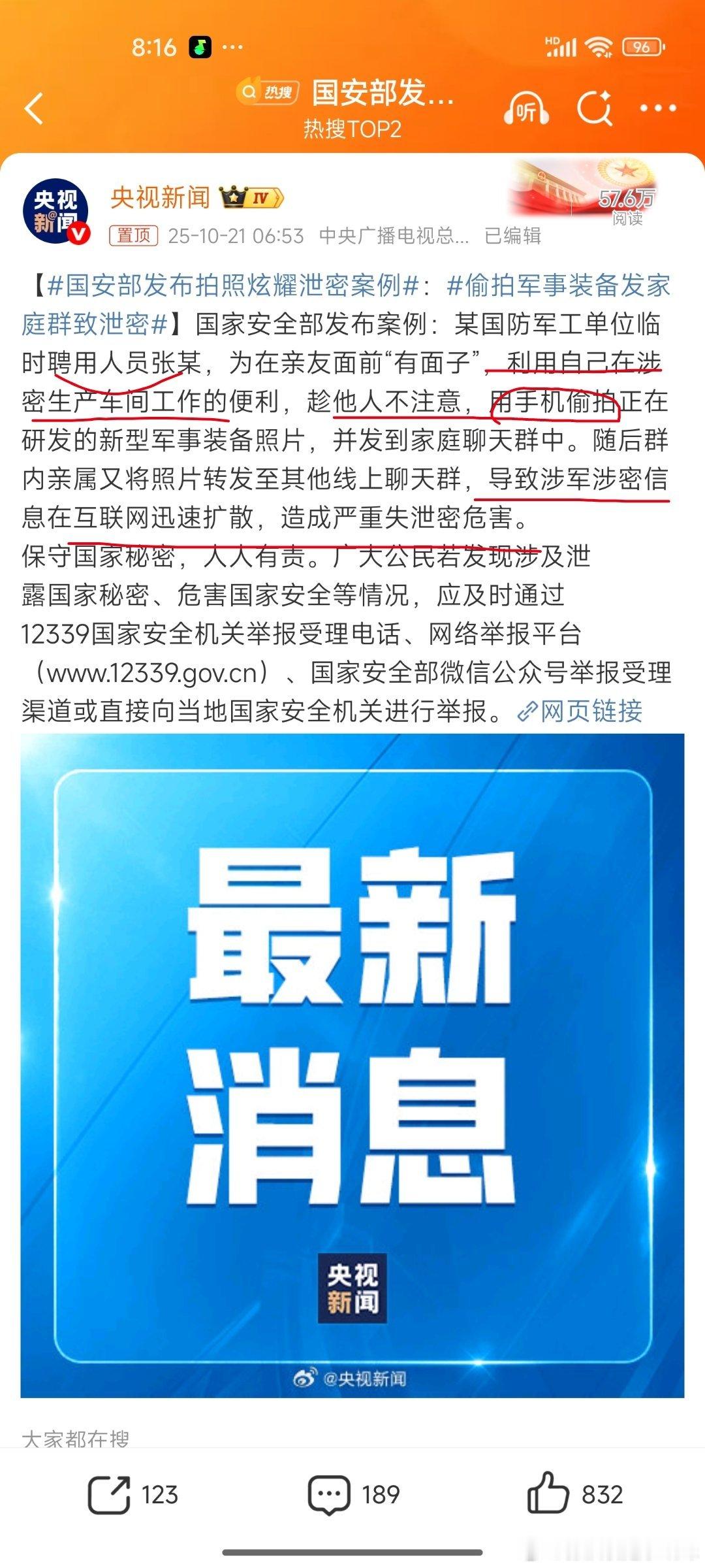 国安部发布拍照炫耀泄密案例这不对吧……涉密车间为什么随随便便一个临时工就可以带手机?还能掏出手机拍?临时工都能接触?那间谍去应聘临时工岂不是手拿把掐的……感觉还没有很多食品加工车间管得严[允悲]