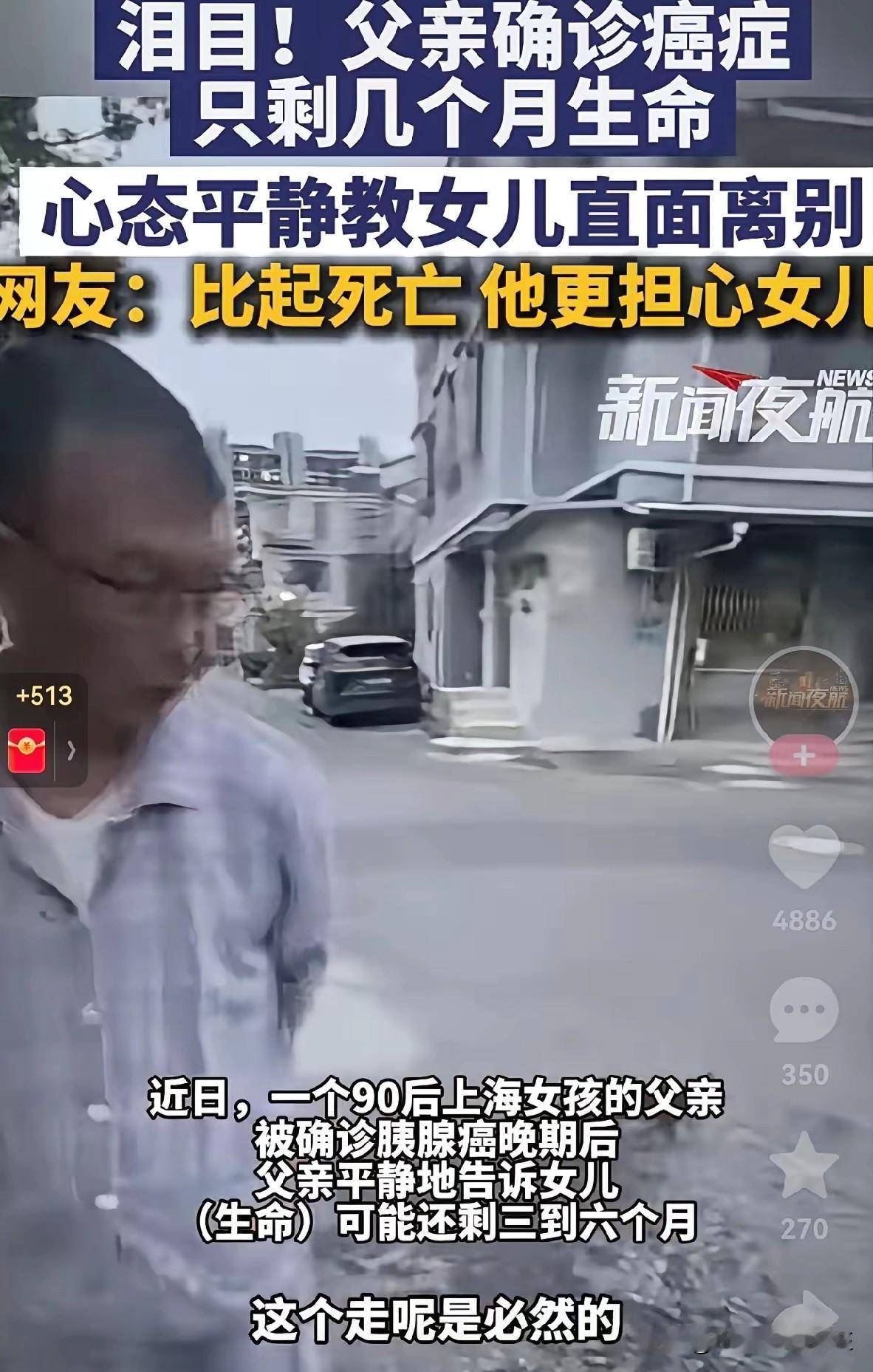 泪目了!近日,上海的一位男子确诊为胰腺癌晚期,医生断言他的生命所剩无几,可能也就是几个月的时间了! 在上海一家医院的病房里,67岁的老周确诊胰腺癌晚期后,平静地告诉女儿:“就当我去旅行了,死亡是另一场出发。” 这位父亲选择拒绝化疗,用最后三个月整理家族相册、录制人生故事,教女儿学会“笑着告别”。他的床头摆着女儿从黄山带回的松果标本和未拆封的跳伞体验券。 “这段路如果不走,十年后也得走;生不带来,死不带走,不要为改变不了的事情过于悲痛。”女儿小周的眼泪夺眶而出,父亲却用最温和的语气,为她上了最后一堂人生课。 医学数据显示,胰腺癌晚期患者中位生存期仅三至六个月。面对这个“癌症之王”,老周独创了“死亡预习法”,他在病房白板上用红色马克笔写下“旅行清单”:看一次海上日出、学做女儿最爱的荠菜馄饨。 每完成一项,他就在后面画个小太阳。“爸爸说每个太阳都是他留给我们的能量站。”小周指着墙上歪歪扭扭的简笔画笑道。 这样的故事并非孤例。在江苏盐城,72岁的顾全平在儿子陪伴下,于2015年完成了人生首次跳伞。这位胃癌晚期患者从8000米高空跃下时大喊:“美得很啊!” 通过澳大利亚自驾旅行,这位被医生判定只剩三个月生命的老人,将生命延长了整整三年。 数据显示,参与“临终旅行”的癌症患者中,68%的人对死亡的恐惧显著降低。北京协和医院舒缓医疗科主任李薇指出,像老周这样主动规划生命终章的患者,其焦虑指数比被动接受治疗者低41%。 老周在病房里完成了最后一项清单任务:和女儿共骑病房走廊的电动代步车。车轮碾过阳光投射的光斑时,他哼起了年轻时最爱的《喀秋莎》。 “你看,”他指着窗外飘落的银杏叶,“死亡就像秋天的落叶,不是结束,是大地在准备新的春天。” 这场用旅行哲学重构的生死对话,为千万家庭提供了面对告别的勇气。正如老周在给女儿的信中所写:“真正的告别不是哭泣的仪式,而是带着对方的爱继续前行。”