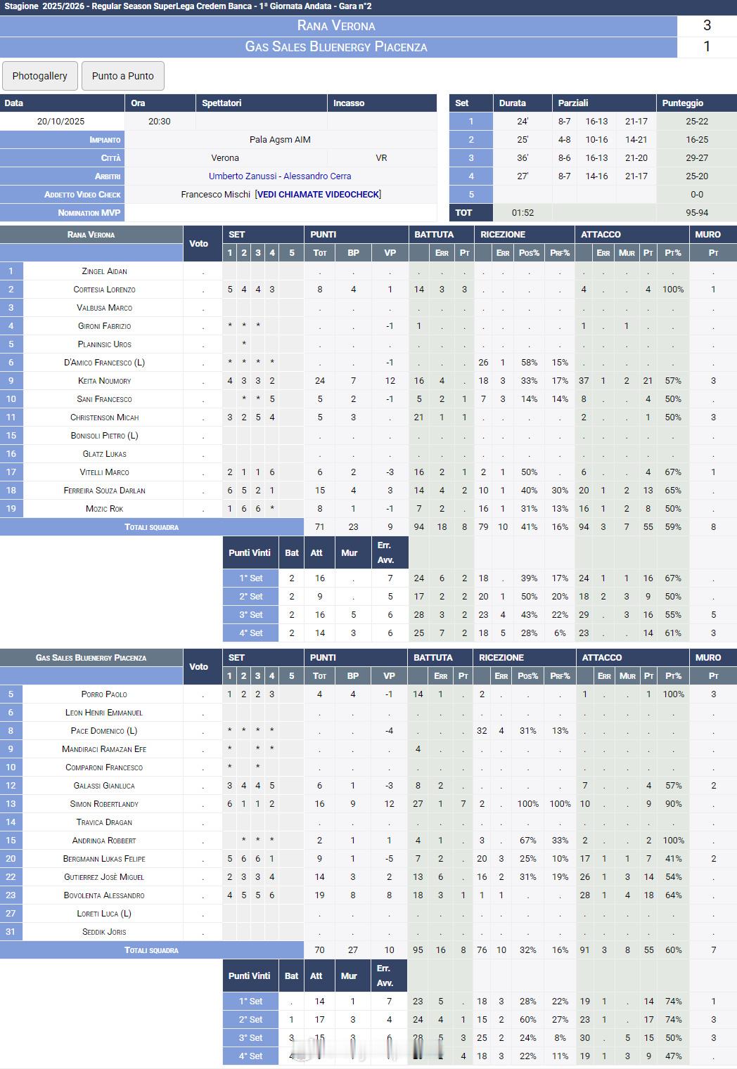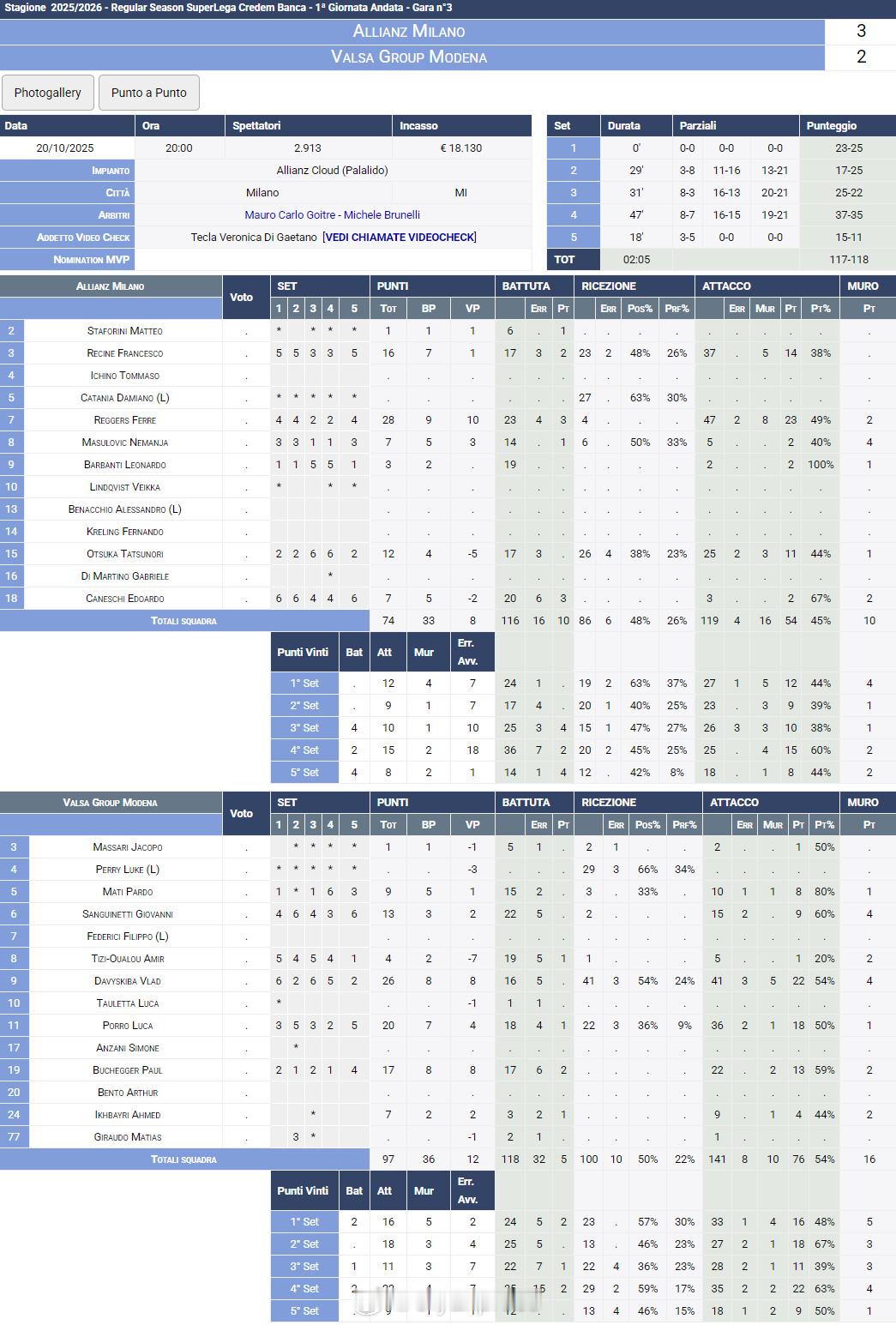 【意超男排揭幕米兰让二追三大逆转摩德纳 维罗纳3-1皮亚琴察】国际排坛战报速递 10月20日,新赛季意超男排联赛揭幕。首轮焦点战米兰主场3-2(23-25/17-25/25-22/37-35/15-11)大逆转摩德纳,取得开门红。雷杰斯28分、雷奇尼16分、大塚达宣12分、19岁新人二传巴班蒂当选MVP,达维斯基巴26分、波罗20分、布切格尔17分、桑圭内蒂13分。维罗纳主场3-1(25-22/16-25/29-27/25-20)击败皮亚琴察,凯塔24分、达兰15分、MVP克里斯滕森5分(2扣3拦),波沃伦塔19分、西蒙16分、古铁雷兹14分。