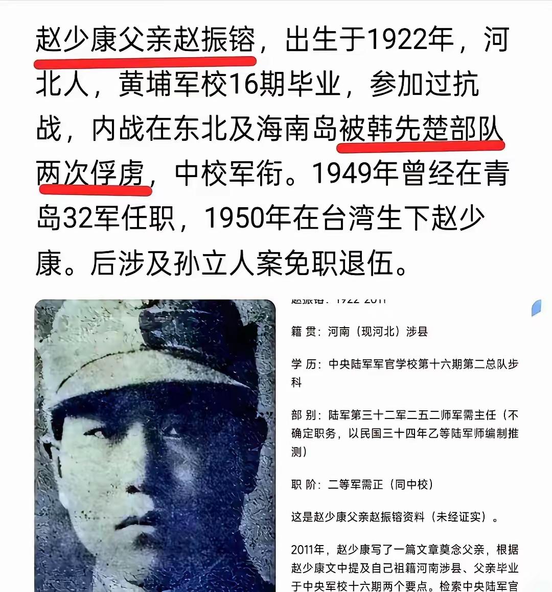赵少康恨大陆原因找到了,赵少康父亲被俘两次。赵少康的父亲名叫赵振镕,在解放战争时期,从东北打到海南岛, 赵振镕在东北时被俘了,解放海南岛战役时,赵振镕又被俘了,1950年,他被遣散回家,回家后带着老婆坐船去了台湾,当时他老婆已经怀孕(赵少康),怪不得赵少康那么讨厌大陆。