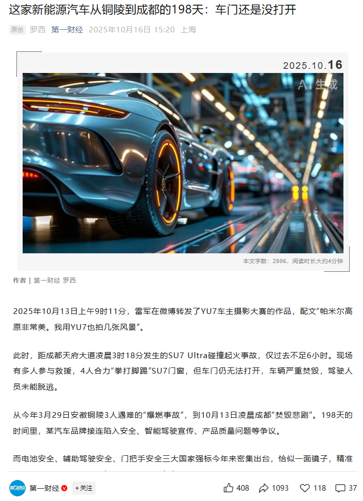 原来10月16日,第一财经除了那边《小米,别让年轻人的第一台车变成最后一台