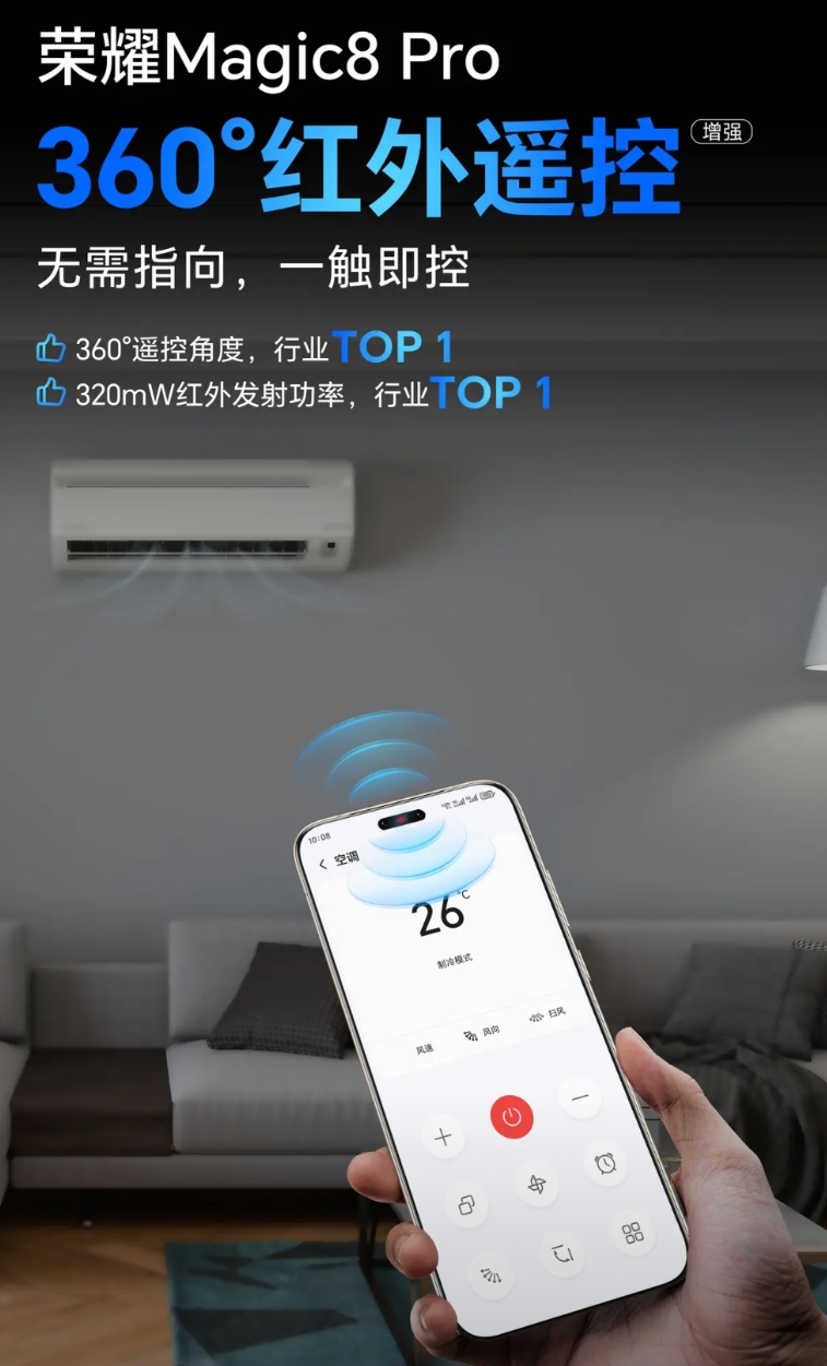 厉害了,刚开始好奇Magic8的红外遥控在哪,因为顶部没有,然后看到真机发现红外遥控在摄像头的位置,想着遥控的时候跟拍照一样要镜头对着电器,然后万万没想到,竟然是个360°无死角遥控!再也不用纠结遥控姿势了!
