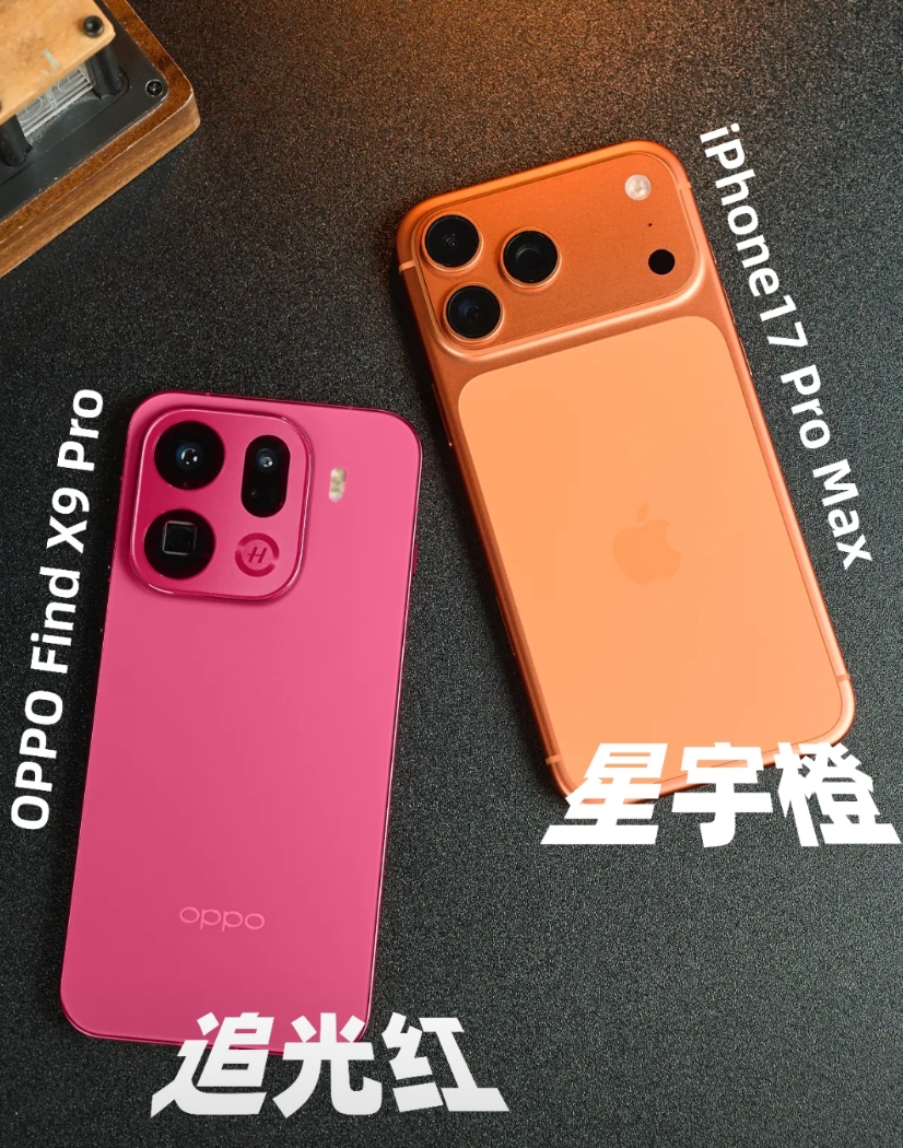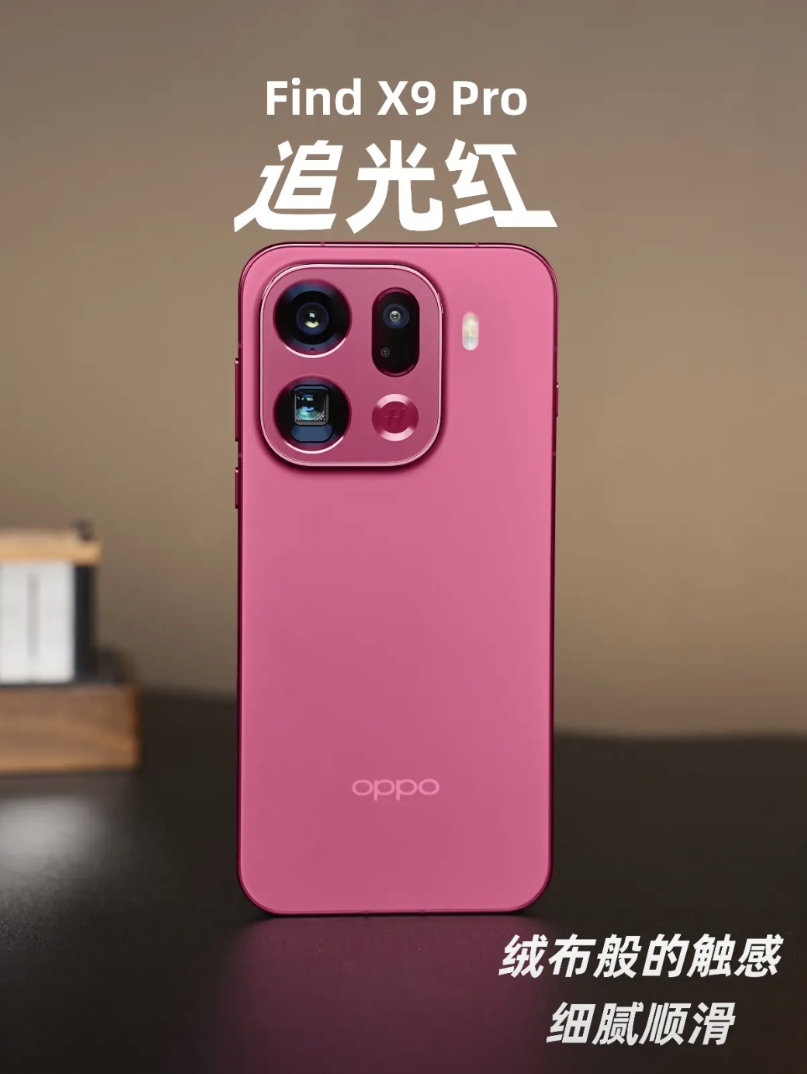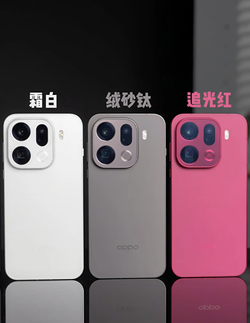 刚刚在网上看到大V们拍的OPPO Find X9 Pro追光红、霜白和绒砂钛这三款配色,质感真的绝了(图4),那个红色很有生命力,跳脱又完全不俗气,是那种很有格调的光泽感;霜白感觉是冷调白皮,干净又高级;绒砂钛就更不用说了,在光线下那种细腻的金属光泽,看起来就很高级,弥补了iPhone17系列没有钛色的遗憾