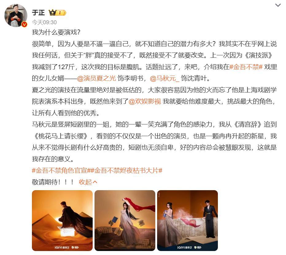 《金吾不禁》今天官宣的是夏之光马秋元,饰演的角色还是于正在戏里的女儿女婿!