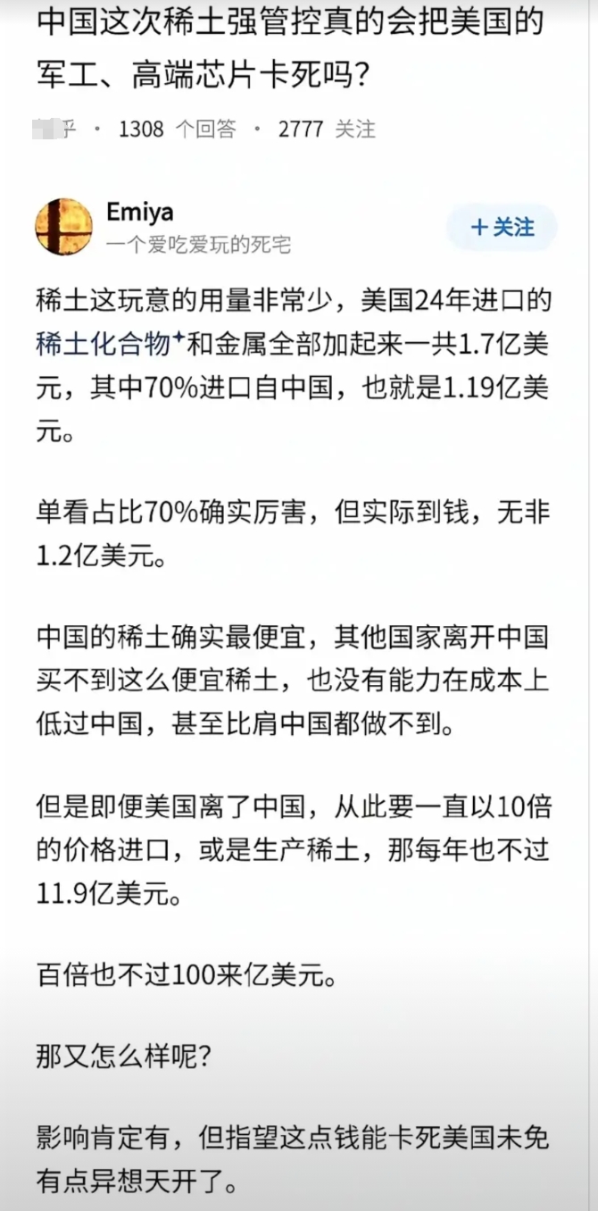 稀土的威慑力绝对被神化了。如果单凭稀土就能卡老美脖子,很多问题早就迎刃而解了,例如:台湾问题美国不敢再插手,对台军售什么的不存在;对华不平等贸易战老美不敢发起;对华科技封锁老美不敢;对华高科技产品禁售等等老美也不敢,否则就卡死他老美脖子,让他跪地求饶,甚至可以让他们用发动机技术,光刻机技术等高科技来交换稀土。