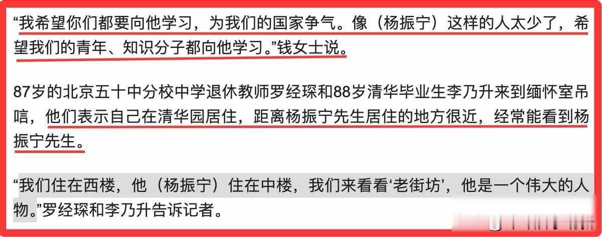 杨振宁走了,翁帆沉默,婚前协议早写好 10月18号,杨振宁走了,一百零三岁,清华摆了七天缅怀室,来的人不少,有学生,有老教授,还有推着轮椅来的老人,他们不是冲着名头来的,是记得他怎么过日子的,他这一生,认真,不装,不躲,网上吵得最凶的,不是他的科学,是他妻子翁帆,四十九岁,没孩子,一个人,以后怎么办。 很多人在问她该怎么办,其实杨振宁早就说了,2004年他和翁帆结婚时,私下讲过,我赞成你再婚,这话不是说允许,是说赞成,他不把婚姻当牢笼,也不让老规矩捆着她,他要的是她能自己做决定,不是光守着一个名分过日子,这不是什么浪漫的话,是他实实在在的安排,他给她的不是钱,是她自己做主的权利。 杨振宁是搞物理的,最常做的事就是猜未来,他和米尔斯一起弄出的那个理论,其实就是用数学算出还没人见过的东西长啥样,他把自己的一生也当成了物理题,他知道人总会走,婚姻总有尽头,孤独躲不掉,所以他早早放手,不让她被感情或规矩捆住,现在好多明星夫妻,死了还要抢财产、争名声,闹得满城风雨,杨振宁不一样,他连死后都不想管,这是科学家的想法,把情感关系看得简单了。 翁帆没回应那些闲话,在《光明日报》发了一篇悼文,全文没说“我”,全在讲“他”,没哭没诉,没借机博同情,也没赶热闹,字里行间很静,可分量不轻,她不是谁的遗孀,是陪他走过后半生的人,她和杨振宁一样,不靠身份过日子,靠的是自己的选择,他晚年捐钱建研究所,帮年轻学者,她不说话,但做的事一样,爱一个人,不是占着,是让他飞,也让自己站稳。 很多人不理解这种做法,我们总担心没依靠,他却怕困住别人,婚前协议在常人眼里是防离婚的,他拿来防孤独,媒体总说没孩子是遗憾,可他带出来的学生遍布全球实验室,有人拿过诺贝尔奖,他的想法还在推着科学往前走,我们看有没有后代,他看有没有传下去。 他留给翁帆的,不是银行卡密码,是她想做什么都能做的那股劲儿,他留给中国的,不是一块奖牌,是一群敢想敢干的年轻人,他留给这个时代的,是一个问题,你说你爱一个人,到底是想把他留在身边,还是想让他过得好,这个问题,他在结婚那天,就写进纸里了。 网上吵得热闹,可真正懂他的人,一句多余的话都不说,翁帆没开直播,没发长文,也没晒旧照,她只是静静写了一篇文章,讲他这一生,这比任何热搜都沉,杨振宁没留下什么惊天动地的话,但他活成了一个答案,人可以这样走,体面,干净,不给谁添负担。