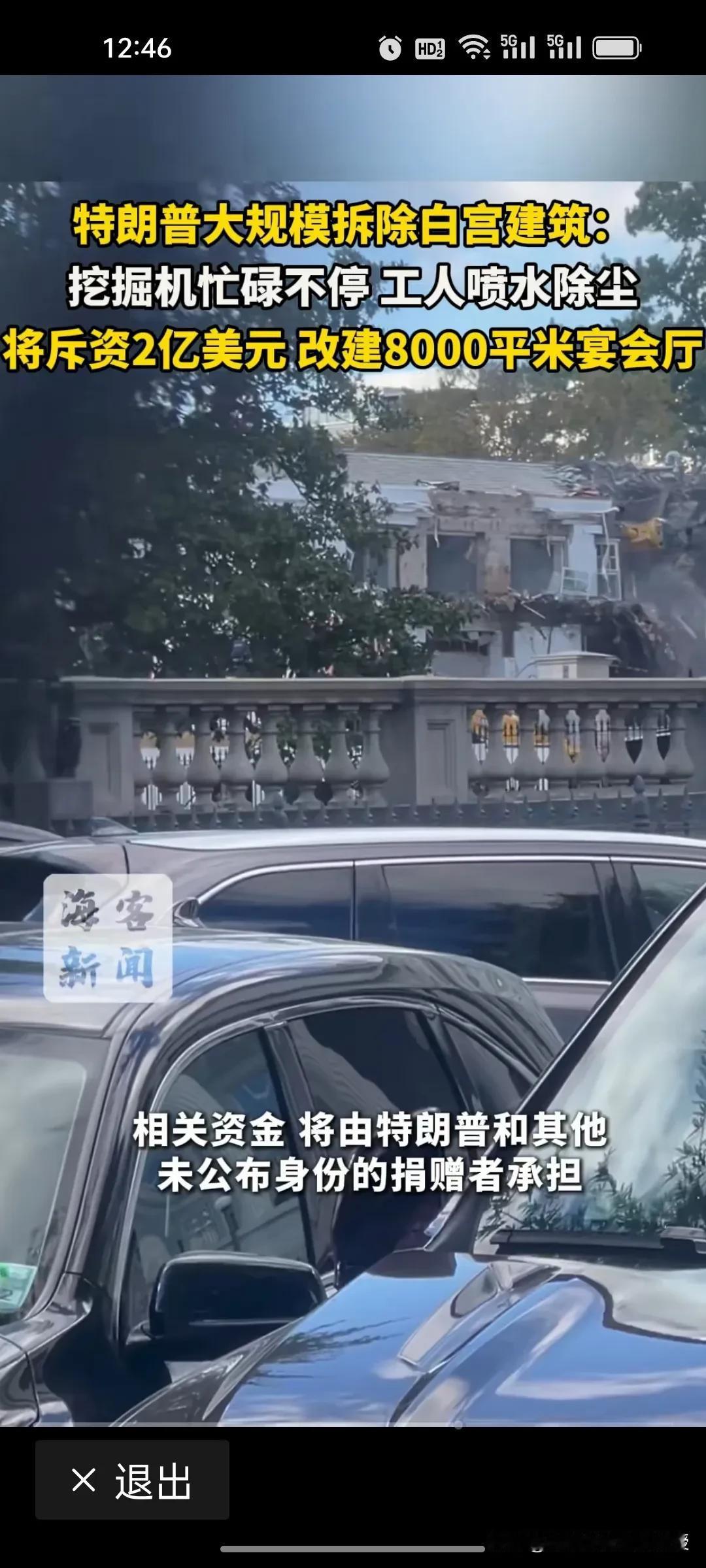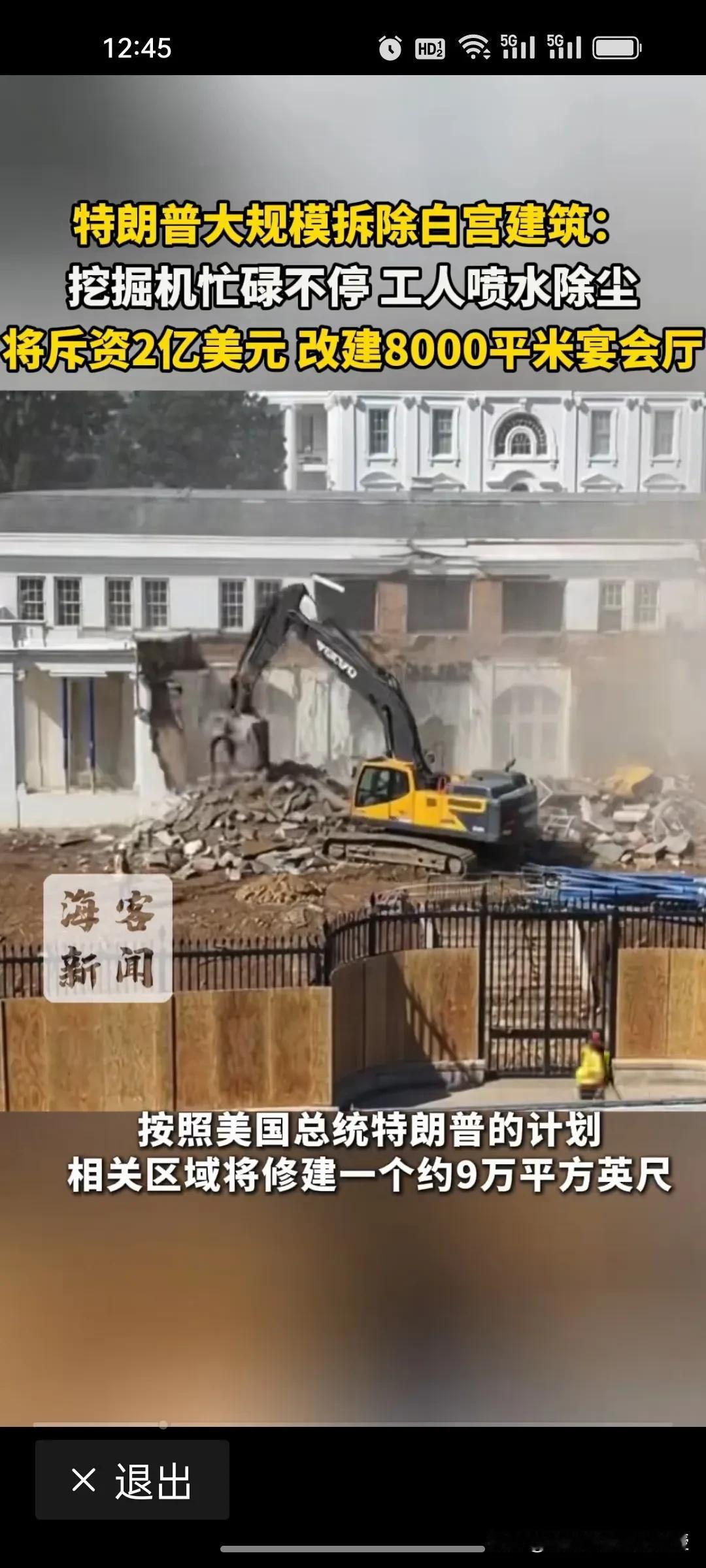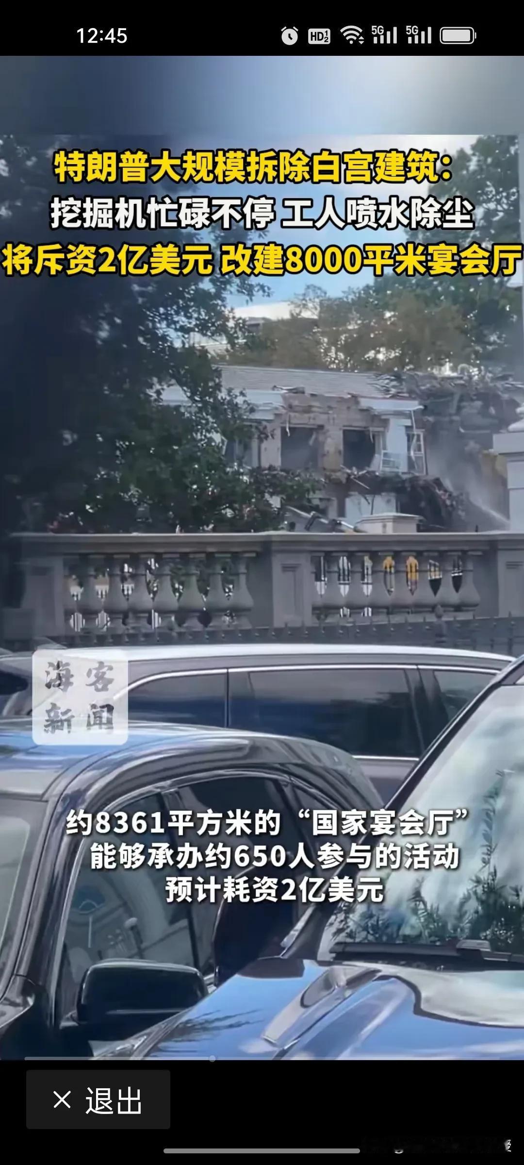 政府都停摆了,军饷也捉襟见肘,700万美国人民游行,可是这丝毫没有撼动特朗普要耗资2亿美元建“国家宴会厅”的决心。 根据《海客新闻》报道,CNN网站消息,10月20日,白宫东翼的建筑开始拆了,要在原地建8361平方,能够容纳650人参与活动的国家宴会厅,这笔开销就高达2亿美元。 政府都停摆了,这个时候特朗普还不省着点花,这个2亿美元是特朗普和未公布的捐赠者承担的。特朗普真的是在哪里都不忘老本行,住到哪里就建到哪里。 在700万人民都上街游行抗议特朗普政府的时候,特朗普却在建举办活动的宴会厅,这般举动无疑是将自身的“面子工程”置于民众诉求与国家困境之上,更显其执政的错位。