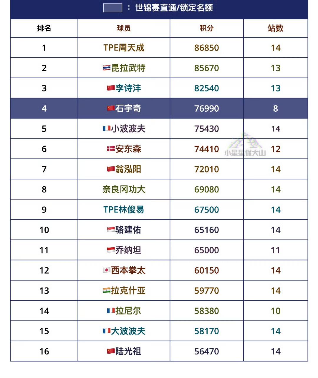 世界羽联通往2025年年终总决赛男单项目排名! 截止2025年丹麦羽毛球公开赛结束,通往2025年终总决赛的男单排名如图所示。 石宇奇前一段斩获了今年的世锦赛冠军,他已确定直通总决赛,获得门票。 石宇奇即便不直通总决赛,仅仅打了八站比赛他就排到了第四位,也是势在必得了。 翁泓阳可惜了,不能去,因为他的积分不可能超过李诗沣了。印尼选手乔纳坦估计会得到参赛资格。