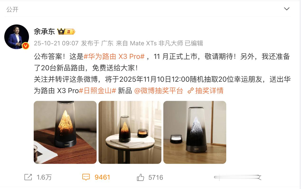 余承东揭秘日照金山新品 余总公布日照金山新品,原来是路由器,我还以为是音响。不过能把路由器做这么帅,有点东西,期待发布啦![哈哈]